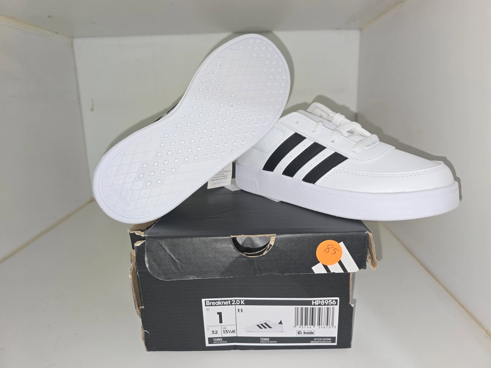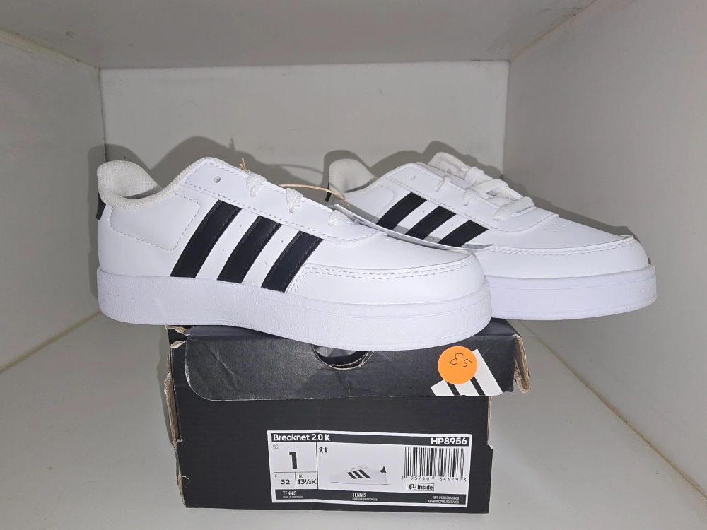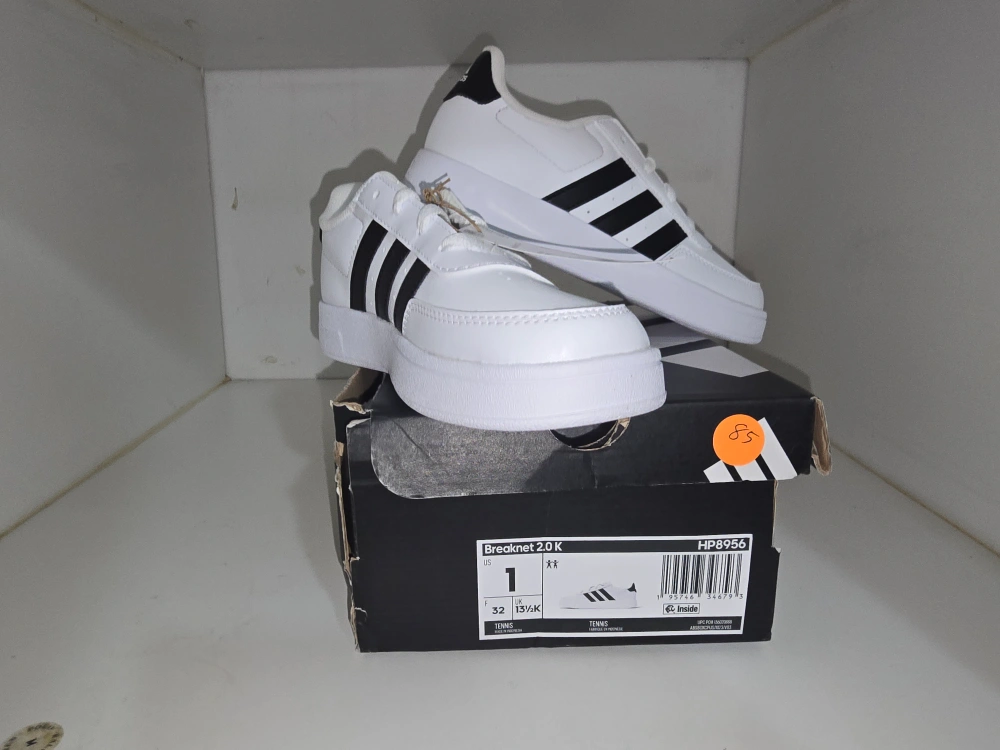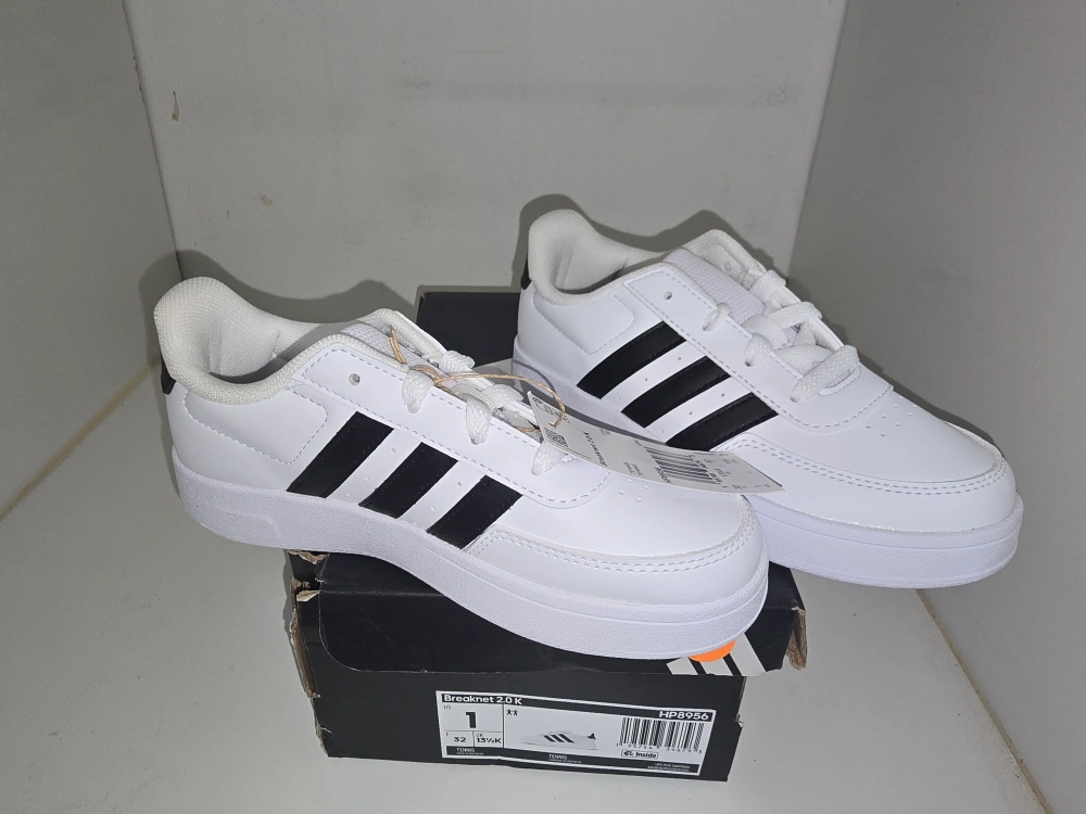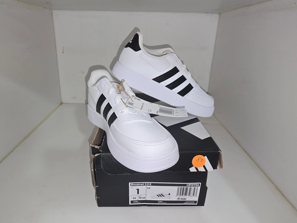 60Selling a pair of Adidas Breaknet 2.0 K sneakers in white with black stripes. These are in excellent condition and come with the original box. The size is 1 youth or 13.5K (US equivalent). Perfect for everyday wear!