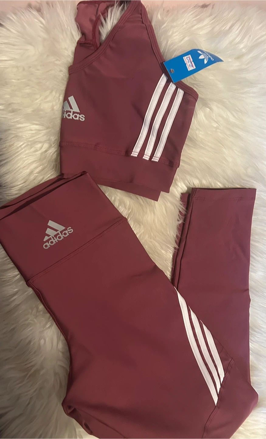 This is a cute Adidas matching set! It includes a sports bra and a pair of leggings, both in a beautiful burgundy color with the classic white three-stripe design. The set is in excellent condition and ready for your next workout or athleisure look