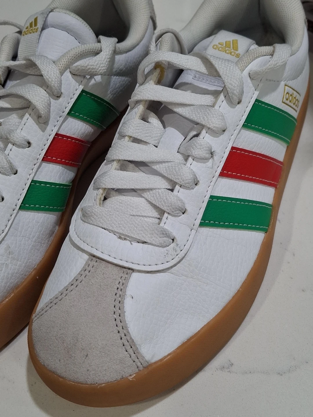 60Selling a pair of Adidas Court Team Bounce shoes in white with green and red stripes. They have a gum sole and are in good condition. Great for everyday wear!
