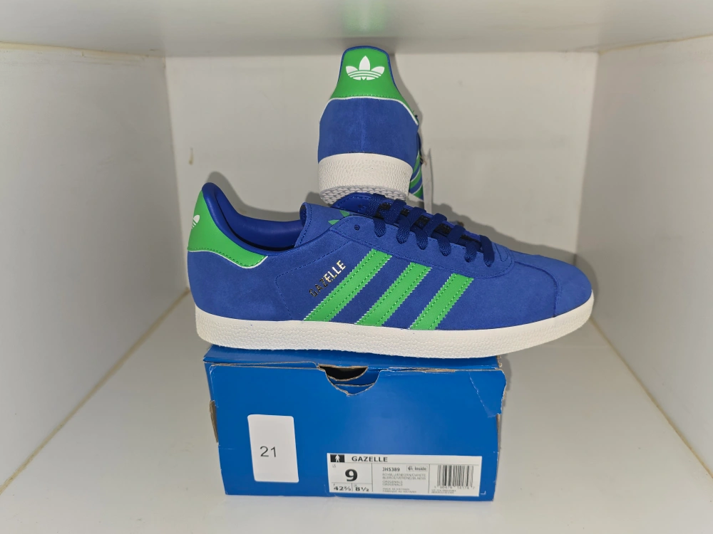 Selling a pair of Adidas Gazelle sneakers in a cool blue and green colorway! They are a US size 9, UK size 8 1/2, and come with the original box. Perfect for adding a pop of color to your outfit!