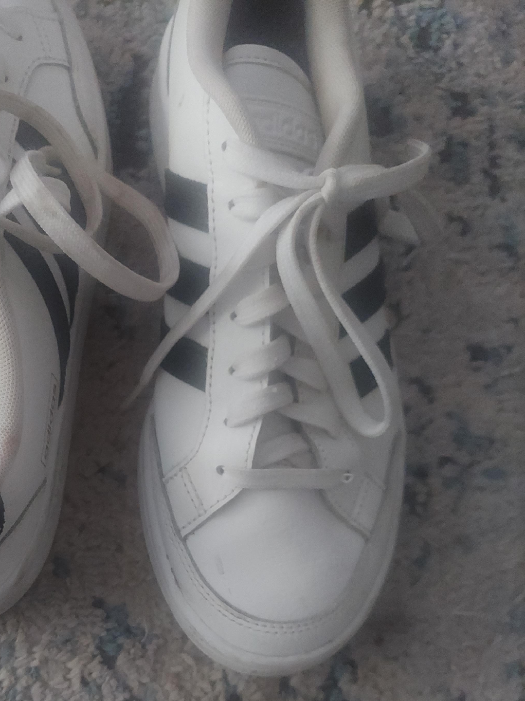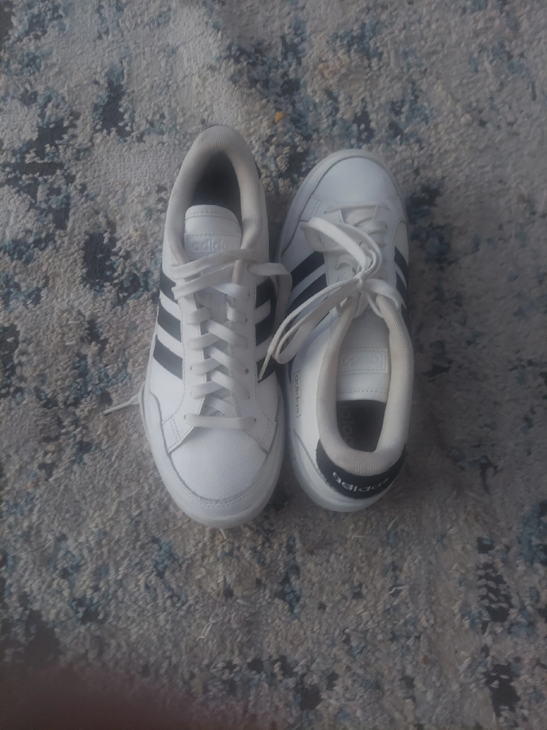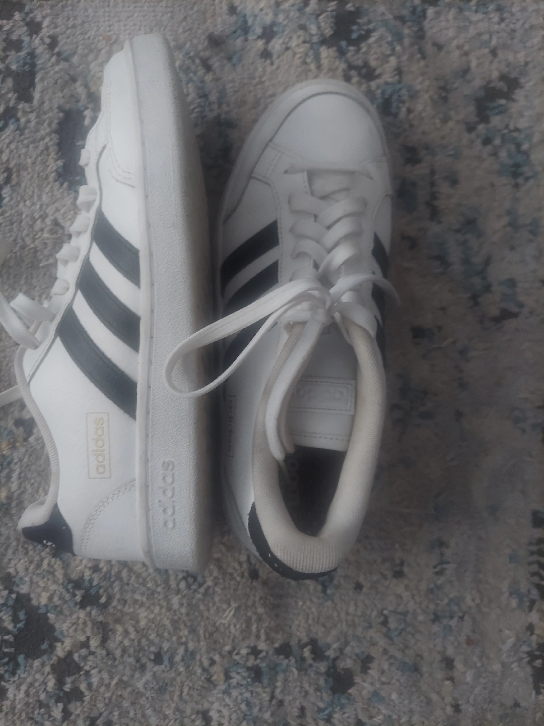 Selling a pair of Adidas Grand Court sneakers in white with black stripes! These are in good condition and ready for a new home. They feature the classic Adidas design and are perfect for everyday wear