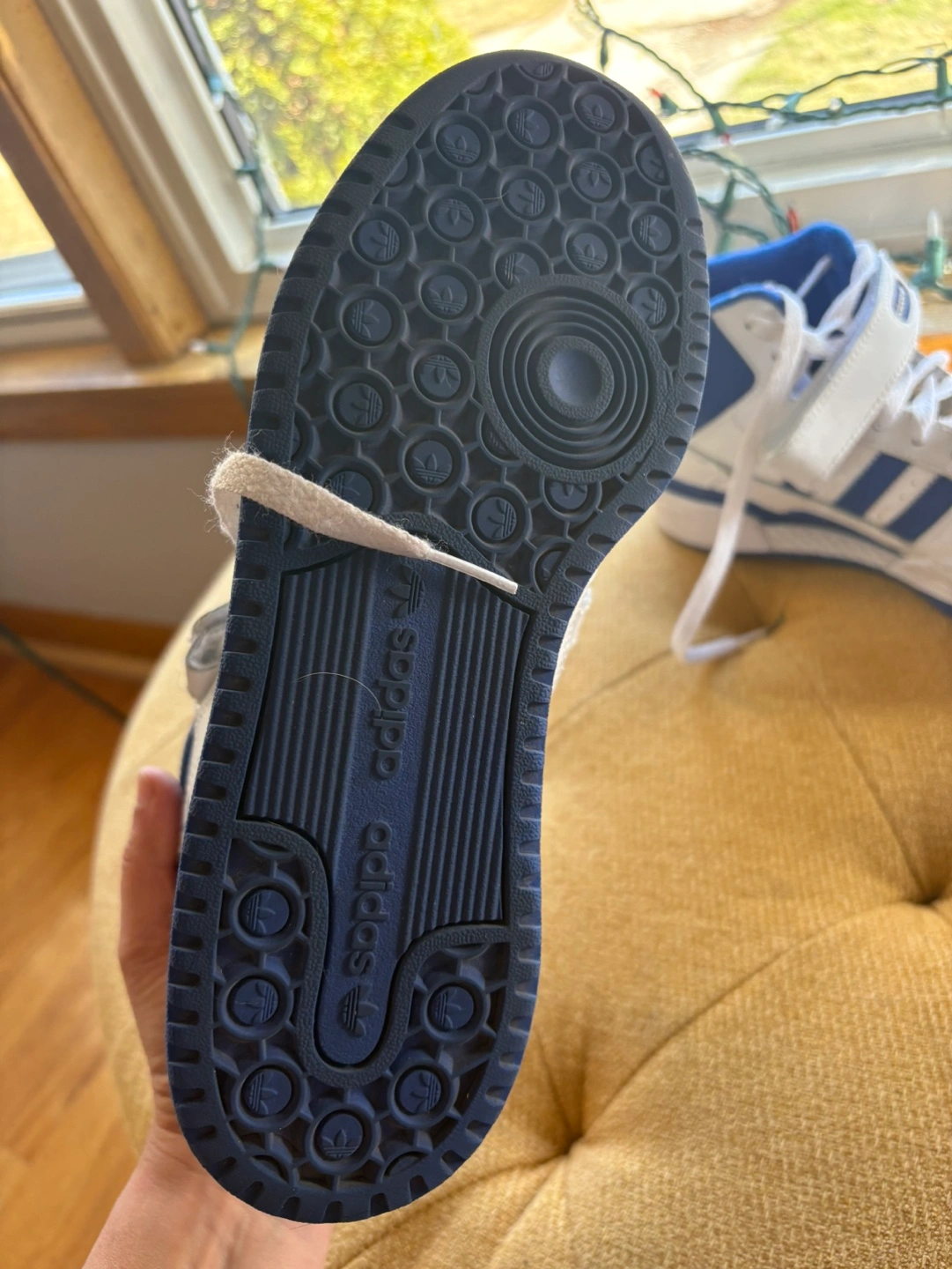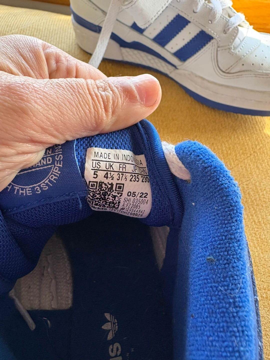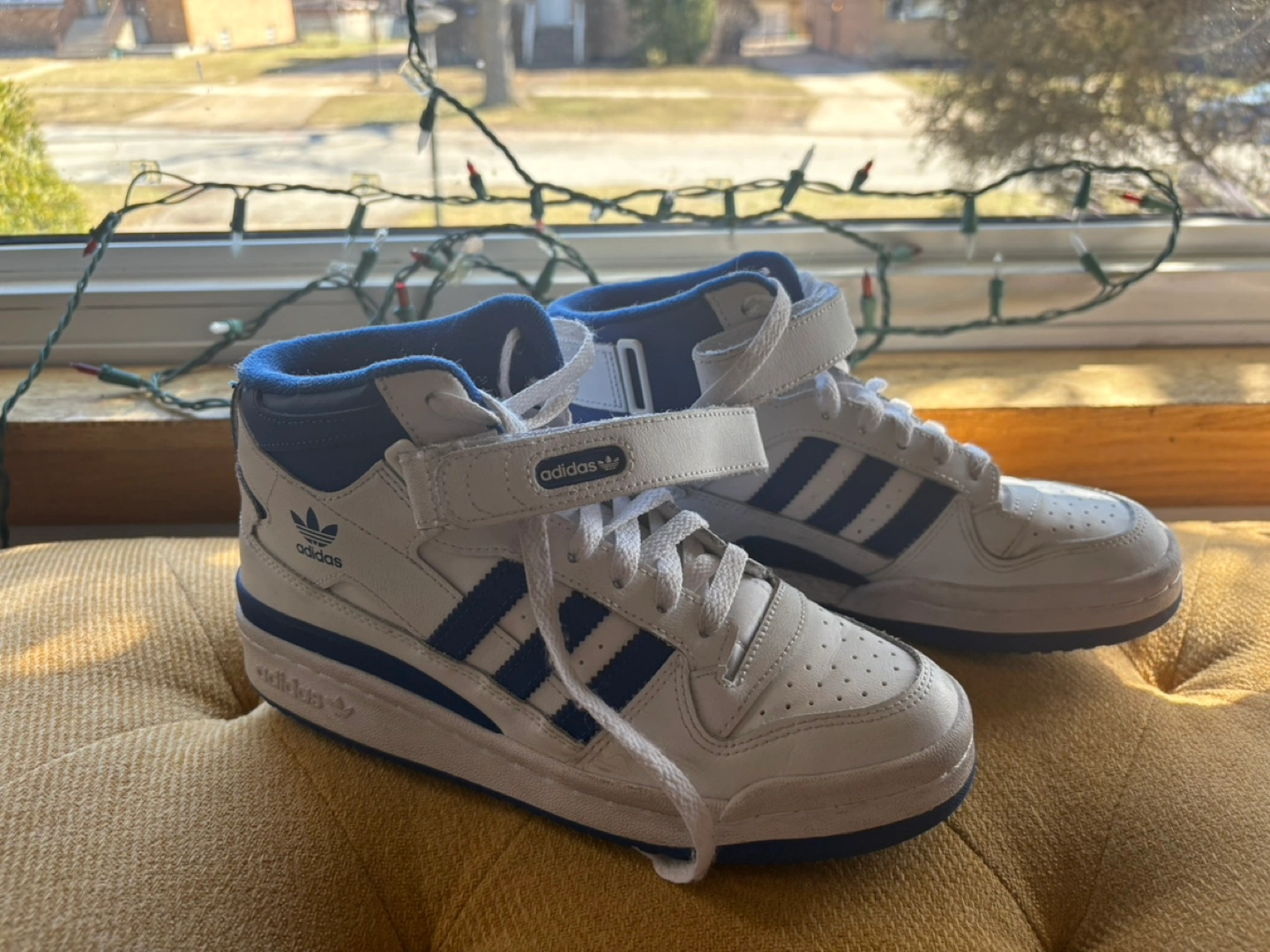White and blue Adidas Forum Mid sneakers. Velcro and laces. Boys size 5. Gently used. Only worn a handful of times. Still in great shape.