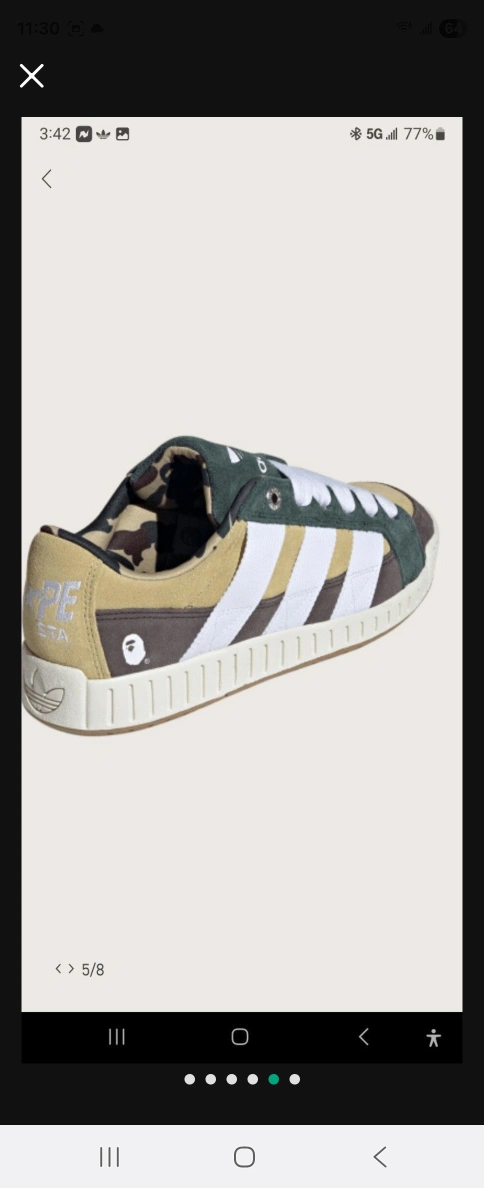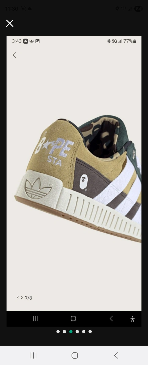 I am selling a pair of Adidas N Bape sneakers. Features a brown, olive green, and white color scheme. The sneakers also have a camo print lining. You can comfortably stroll around in these shoes after a long day.