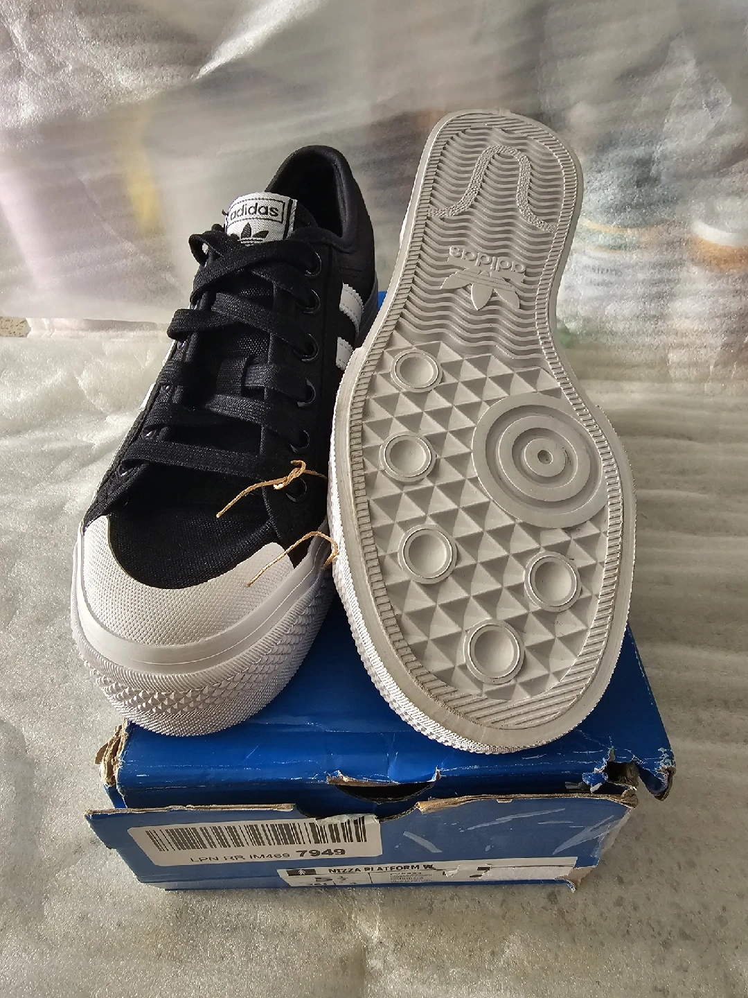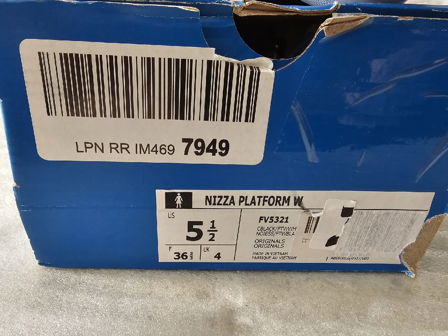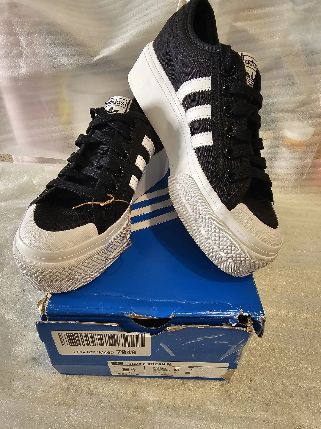 60Selling a brand new pair of Adidas Nizza Platform W sneakers in black and white! They are a women's size 5.5. The box is included. These sneakers are super stylish and comfortable, perfect for everyday wear!
