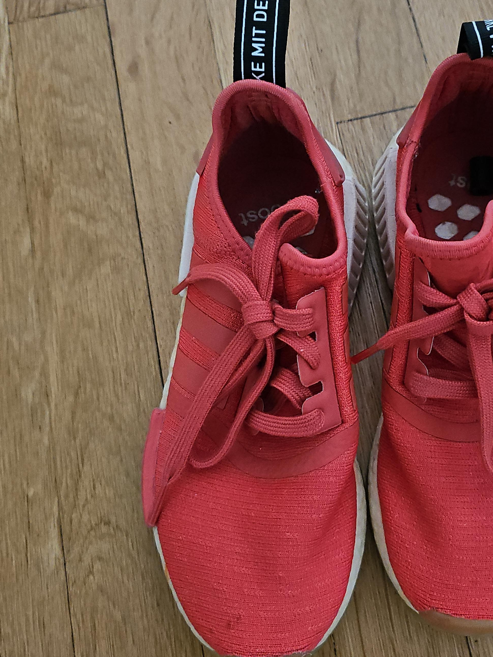 Selling a pair of Adidas NMD R1 sneakers in red. They have a comfortable boost sole. The shoes show some signs of wear.