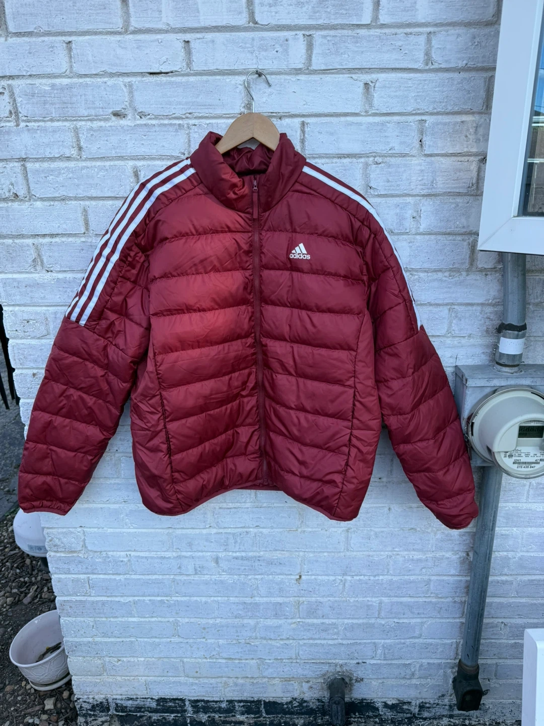 Adidas padded jacket in size XL. It is red with white stripes on the sleeves. The jacket is in great condition and ready for a new home