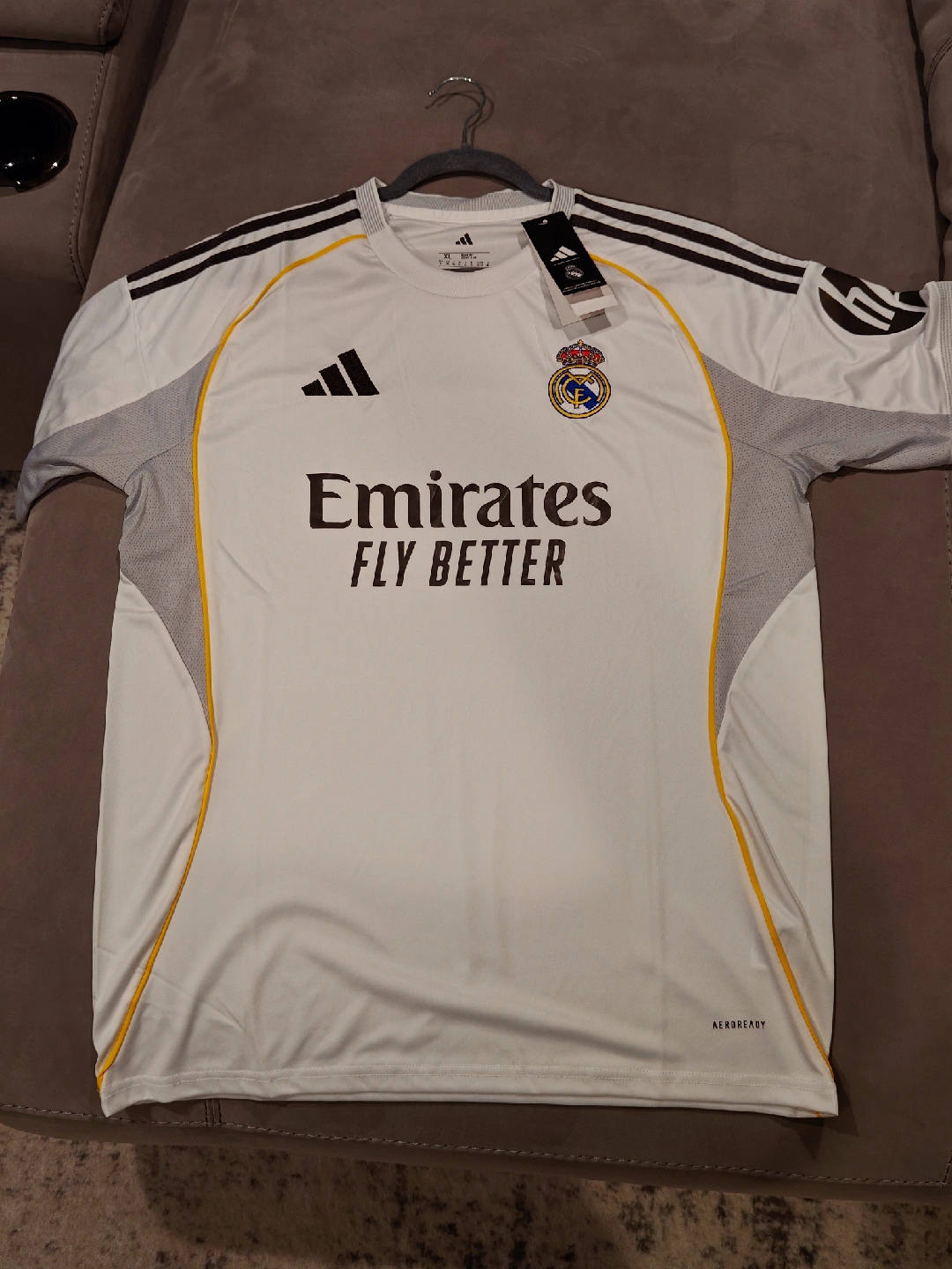 Selling a Real Madrid jersey by Adidas in size XL! It's white with black stripes on the shoulders and the Emirates logo across the chest. The material is AEROREADY.
