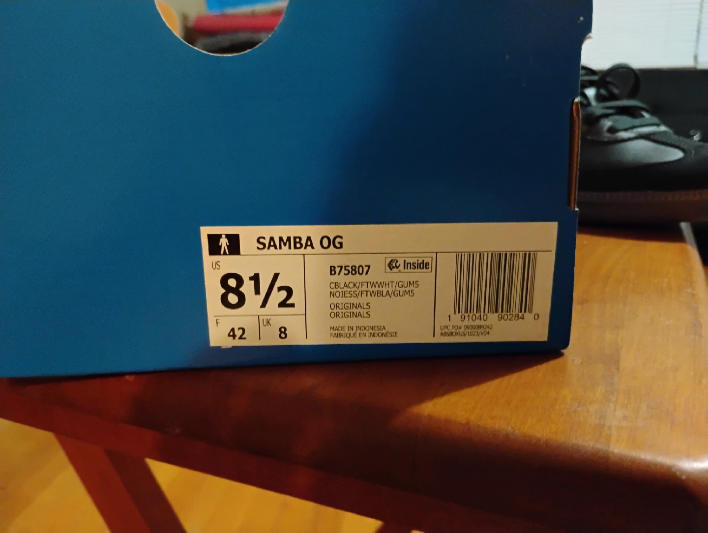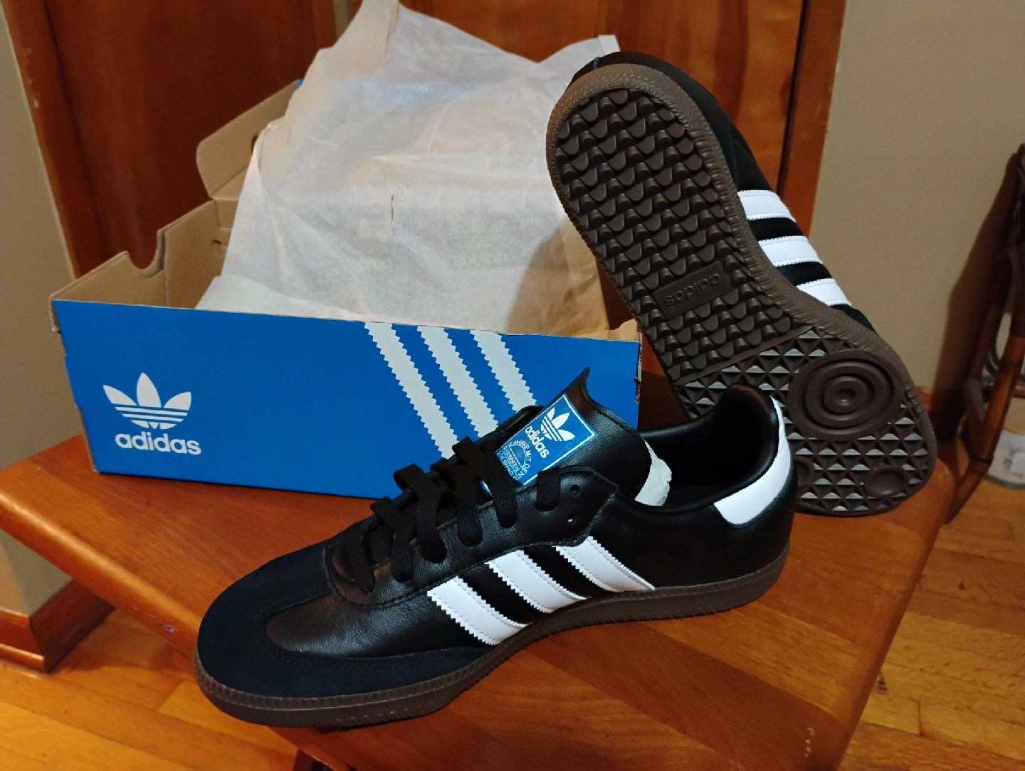 Selling a pair of Adidas Samba OG sneakers in black and white. These are in great condition and come with the original box. They are a US size 8.5. The model number is B75807.