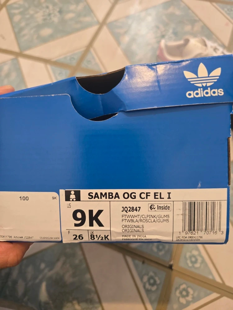 73Selling a pair of Adidas Samba OG CF EL I sneakers in size 9K. They feature a white and pink color scheme. The original box is included!