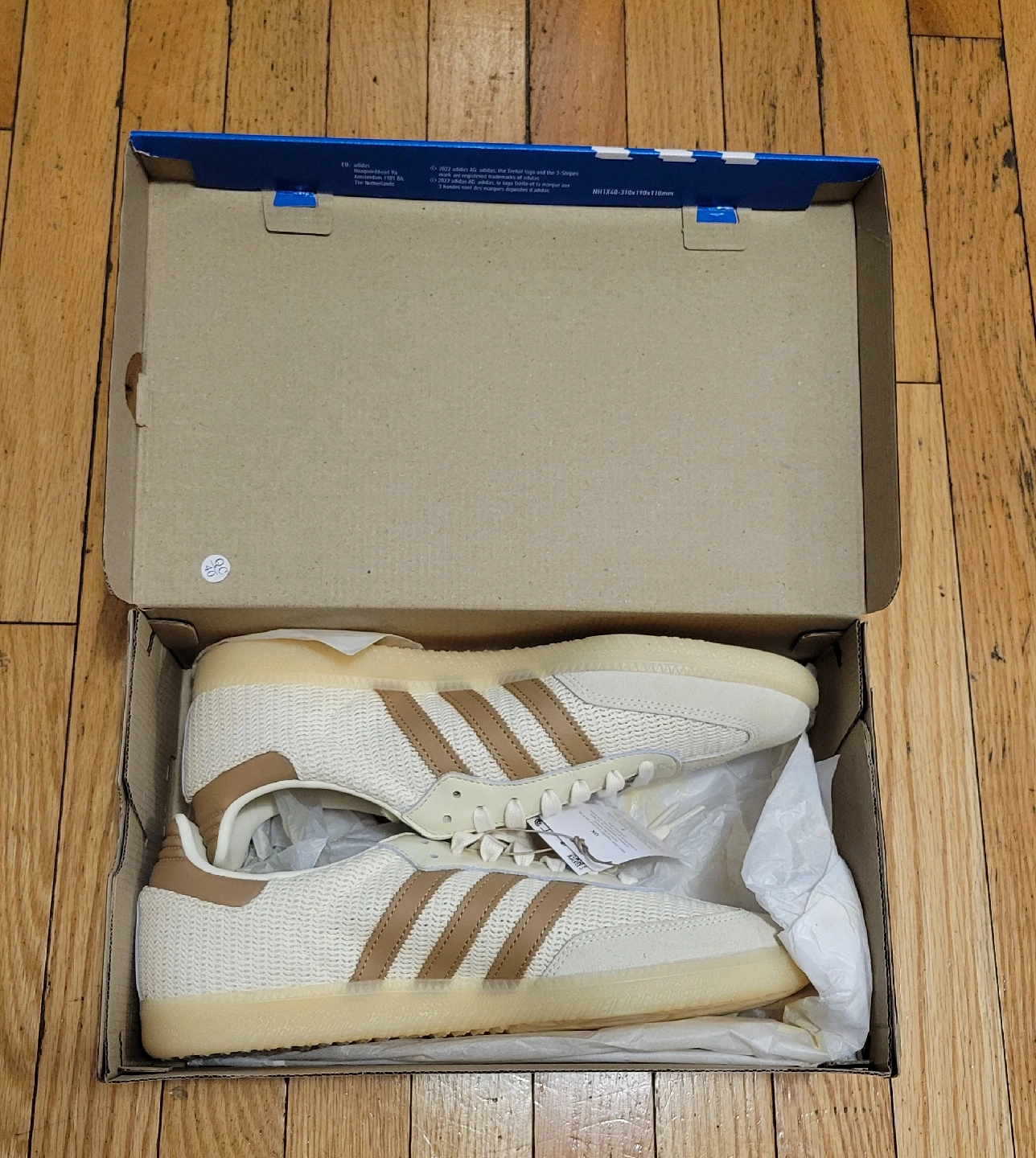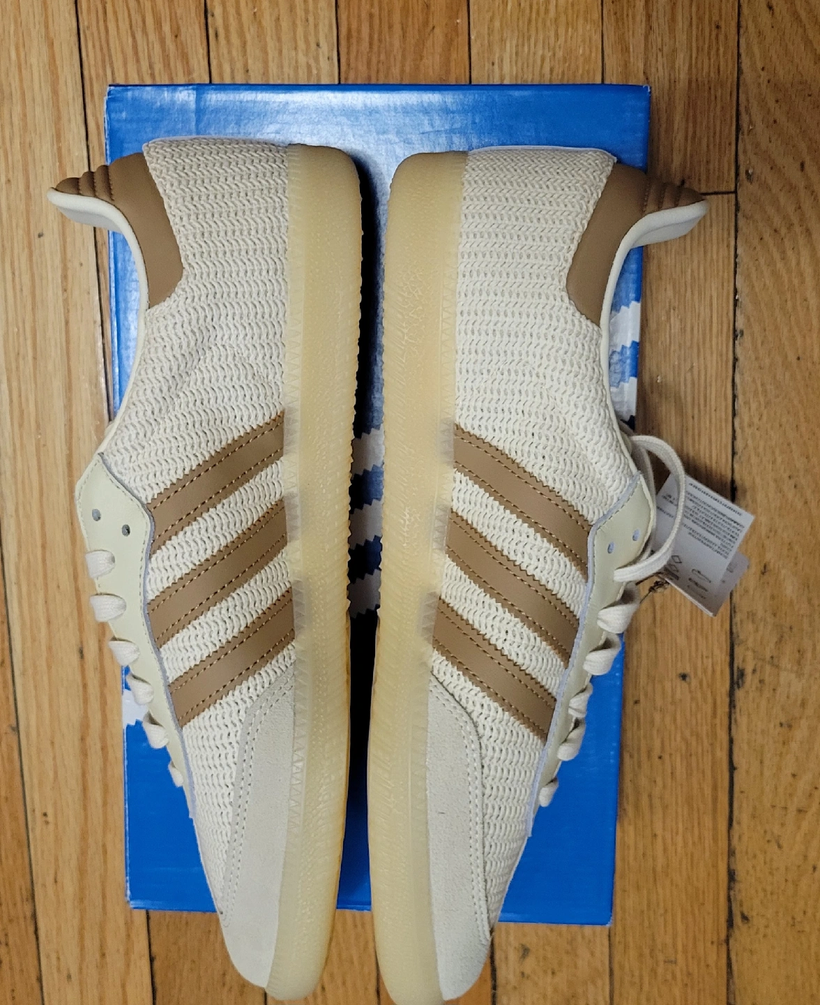 Selling a pair of Adidas Samba OG shoes in US size 9.5. They come in a crewht/cardbo/crysan colorway. These shoes are in great condition and come with the original box