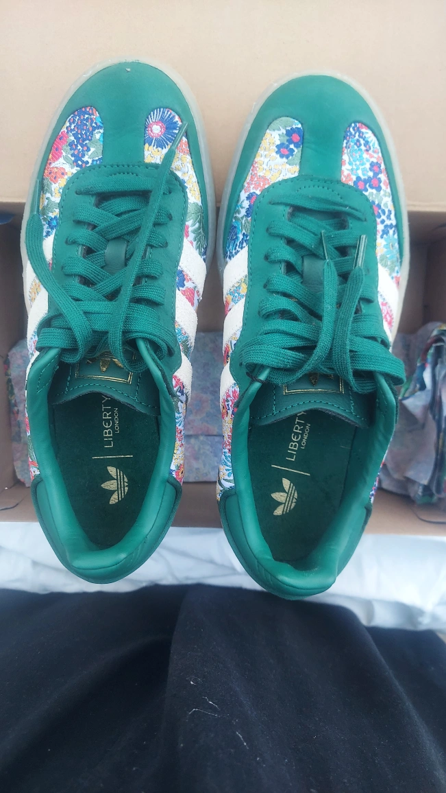 Selling a pair of Adidas Samba sneakers in collaboration with Liberty London! They feature a beautiful floral pattern on a green base. Comes with the original box.