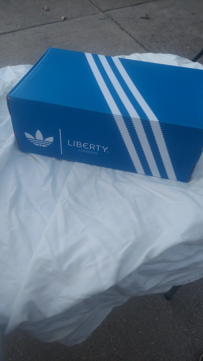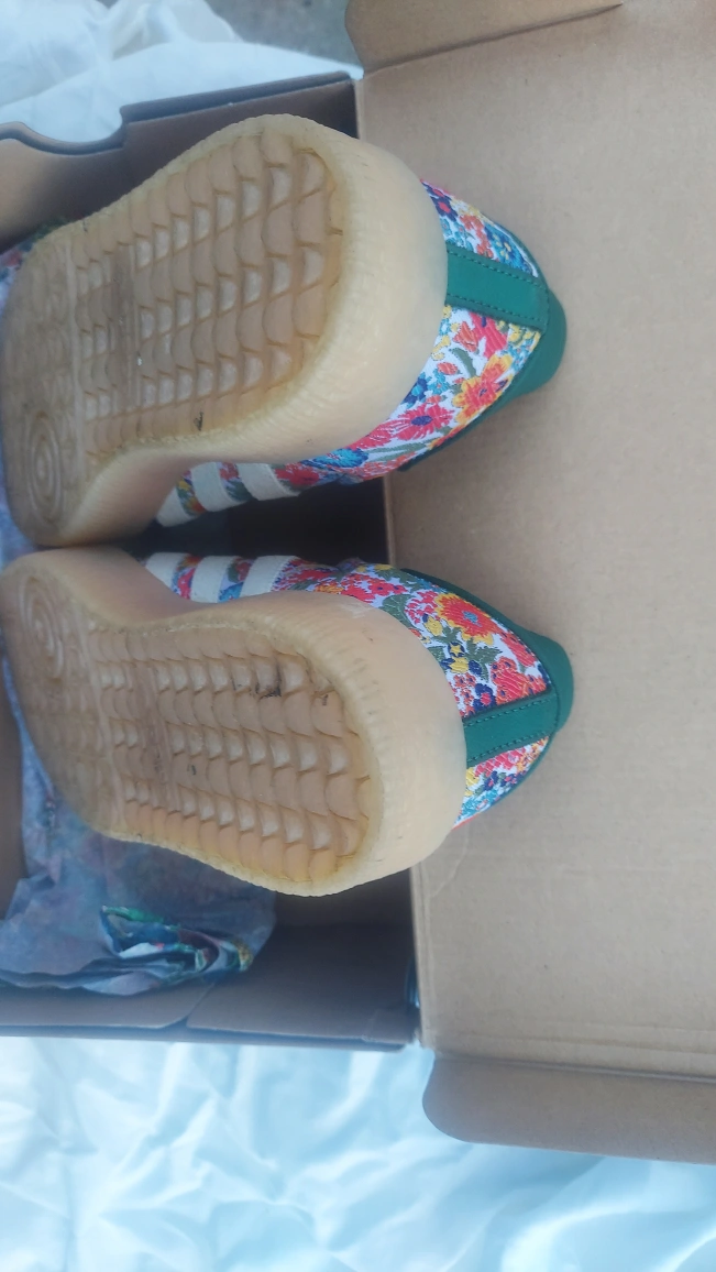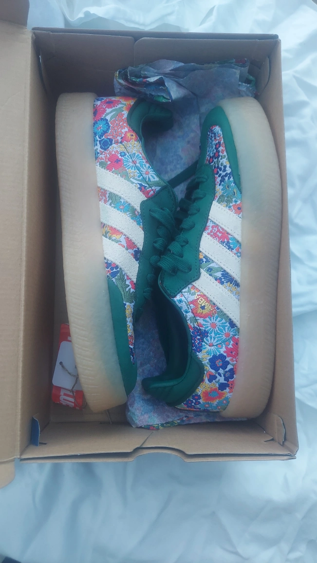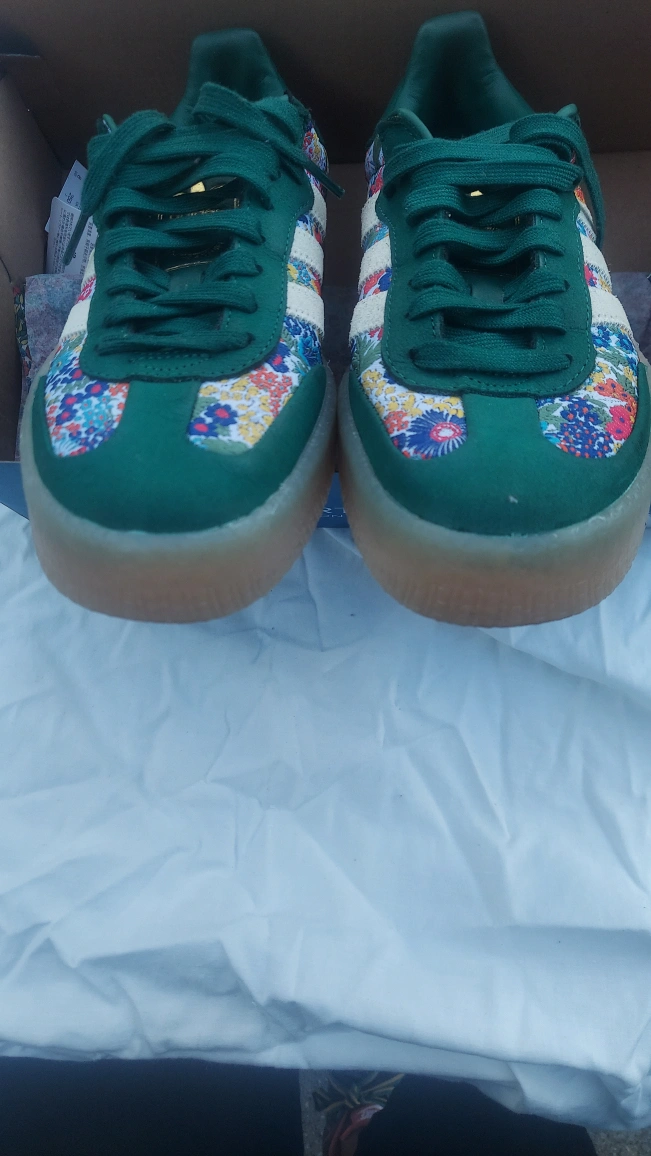 119Selling a pair of Adidas Samba sneakers in collaboration with Liberty London! They feature a beautiful floral pattern on a green base. Comes with the original box.