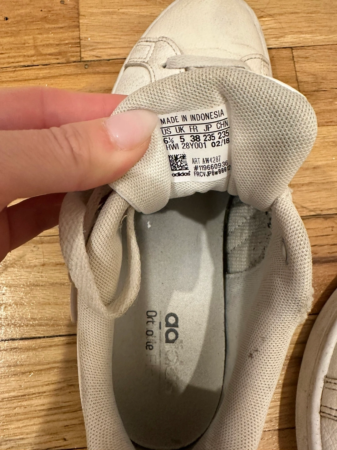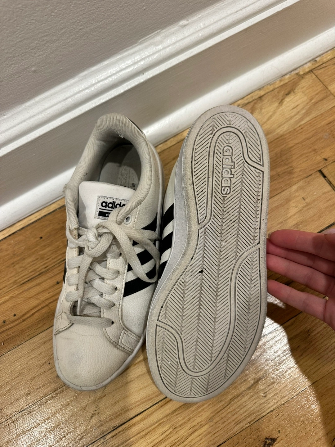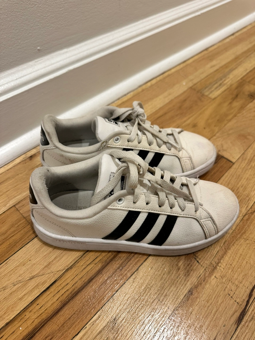 White sneakers with three black stripes on the side. Lace-up closure. The sneakers are clean and ready to wear!