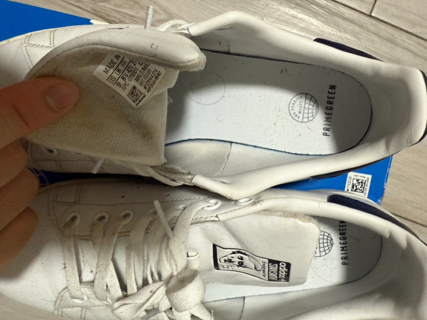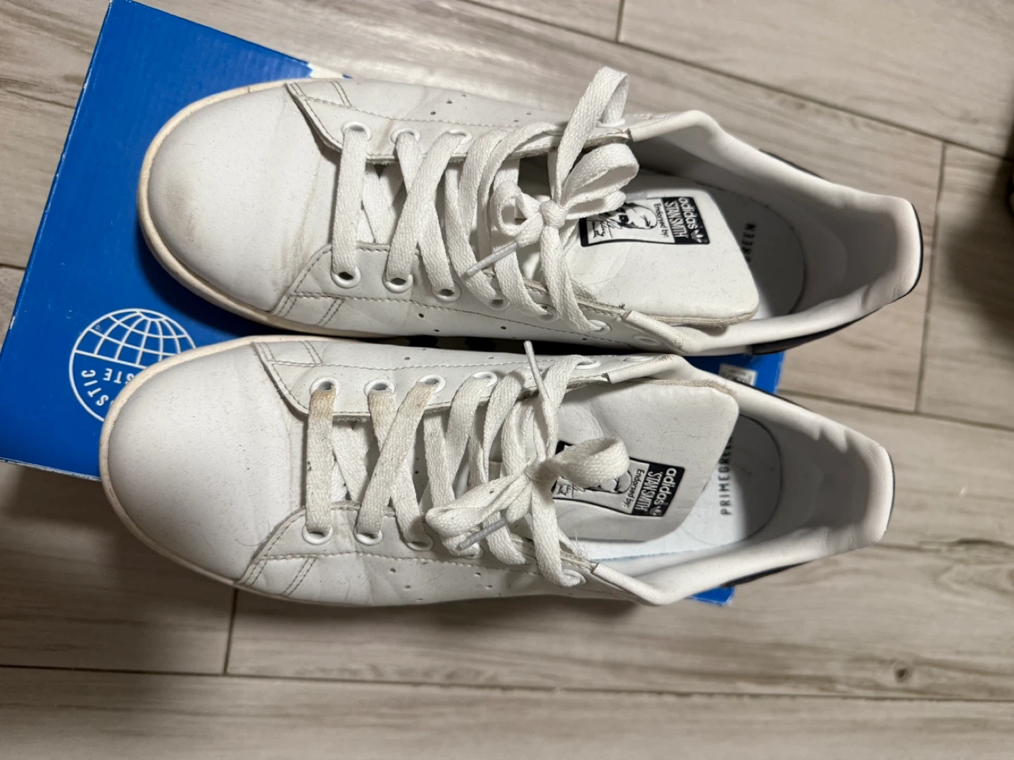 Selling a pair of Adidas Stan Smith sneakers in white. They are a US size 9. There are some signs of wear, but they are still in good condition. The box is included!
