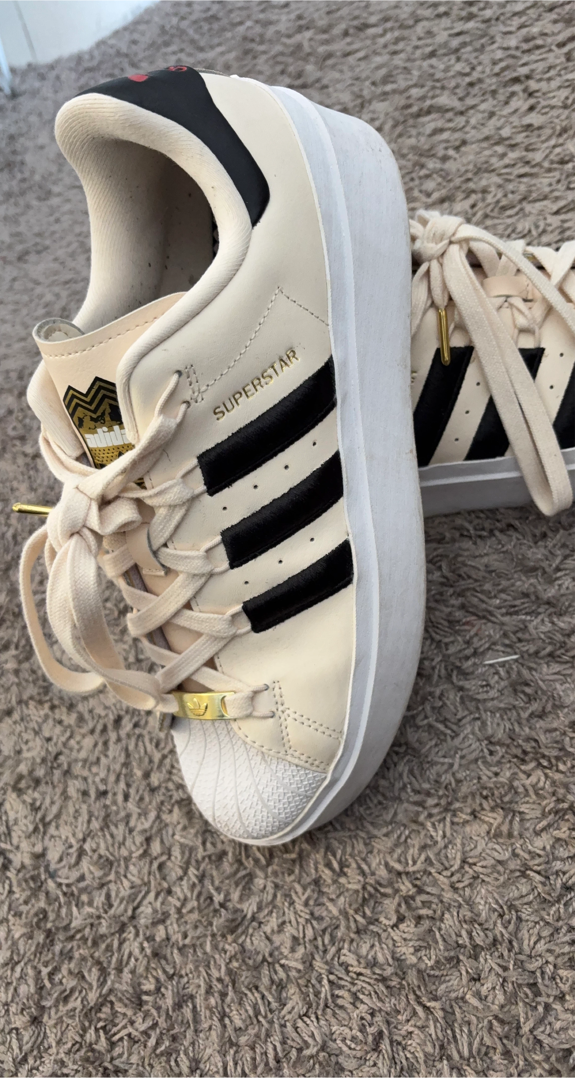 60Selling a pair of Adidas Superstar platform shoes. They are a cream color with black stripes. Perfect for adding a little height to your look!