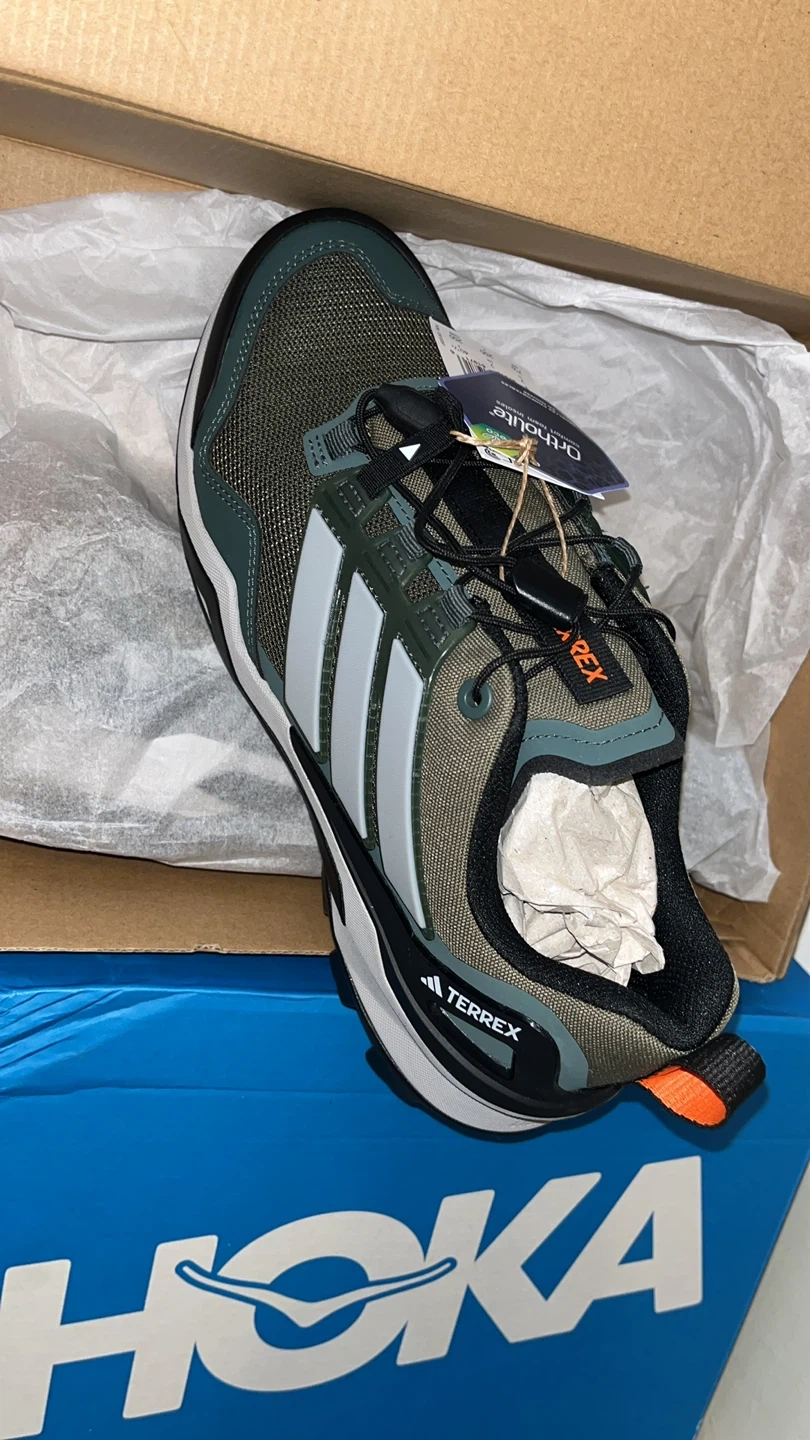 These Adidas Terrex hiking shoes are brand new and come in the original box! They feature a stylish design with the classic Adidas stripes. Perfect for hitting the trails or just everyday wear.