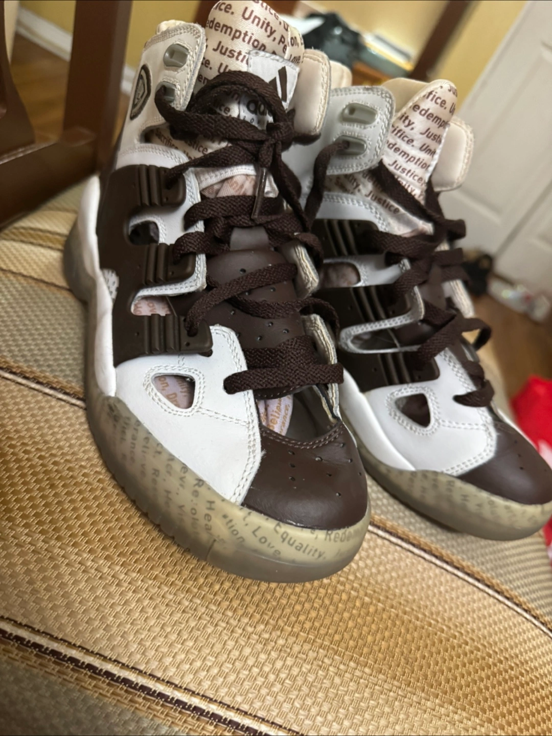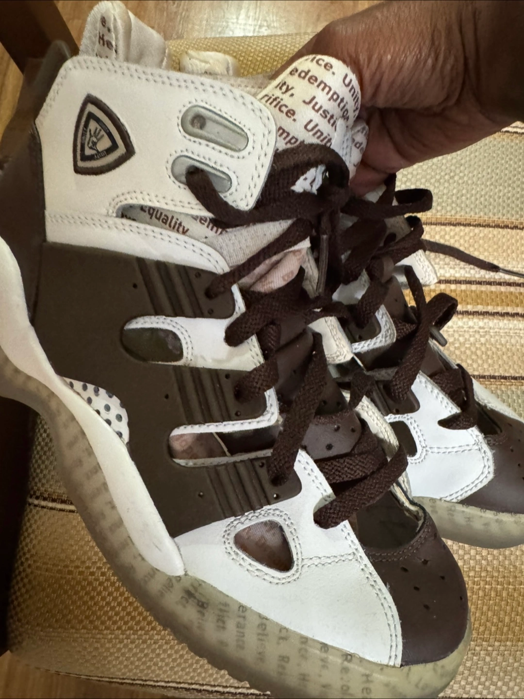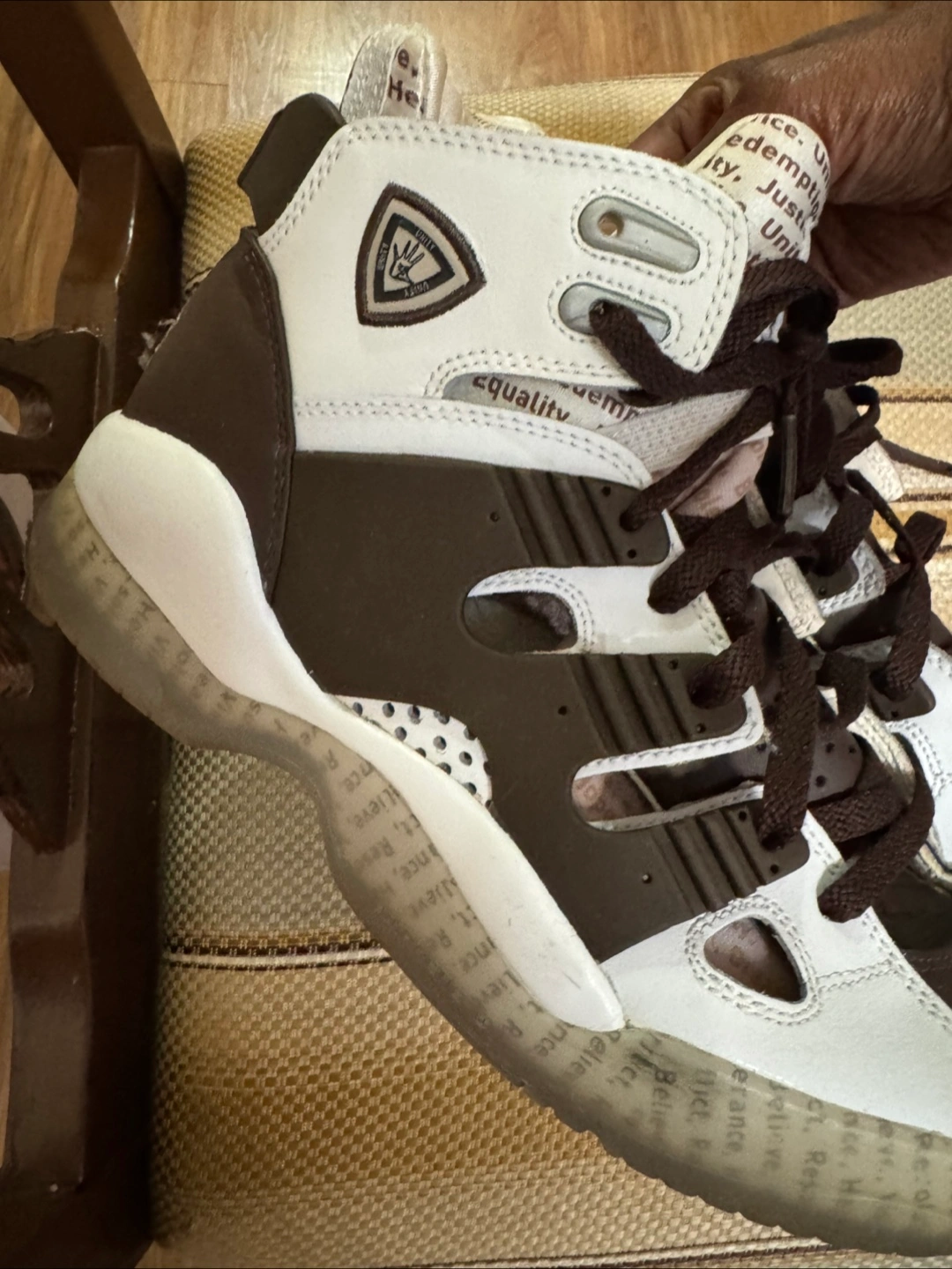 5Brown and white sneakers. High-top design. Features laces, and brown accents. A great addition to any wardrobe to add a touch of uniqueness.