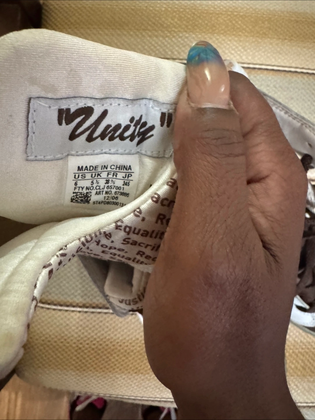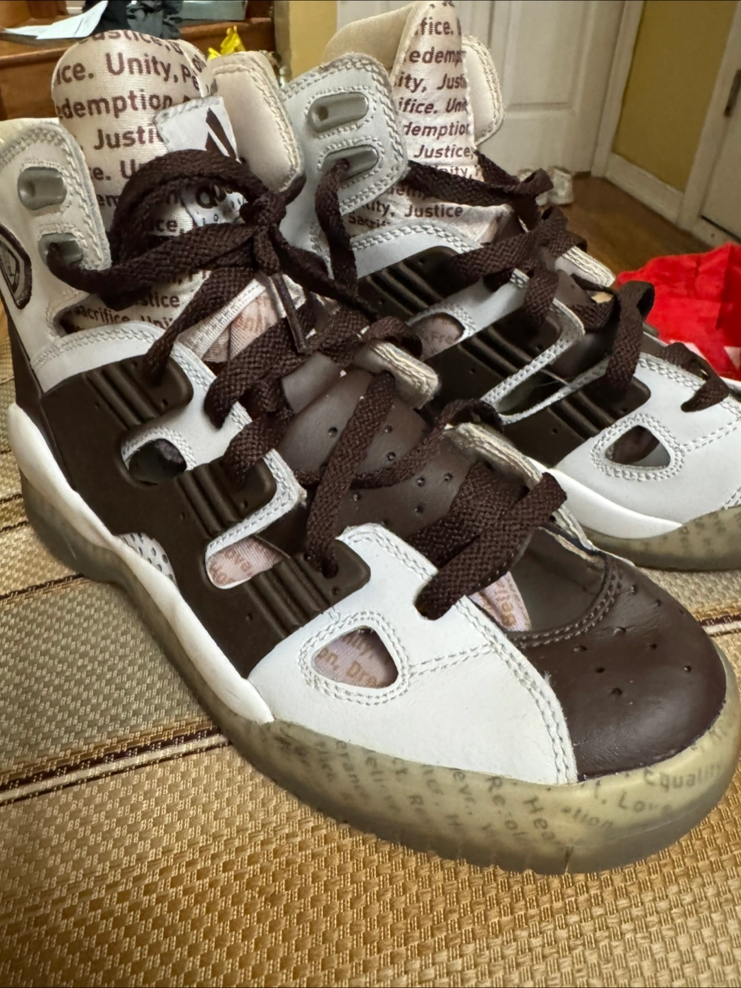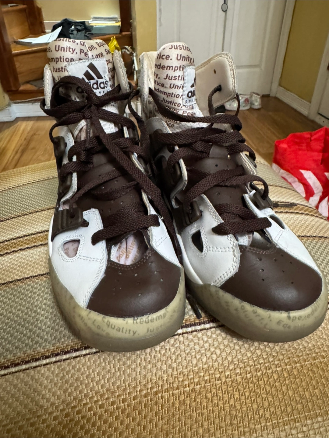 5Brown and white sneakers. High-top design. Features laces, and brown accents. A great addition to any wardrobe to add a touch of uniqueness.