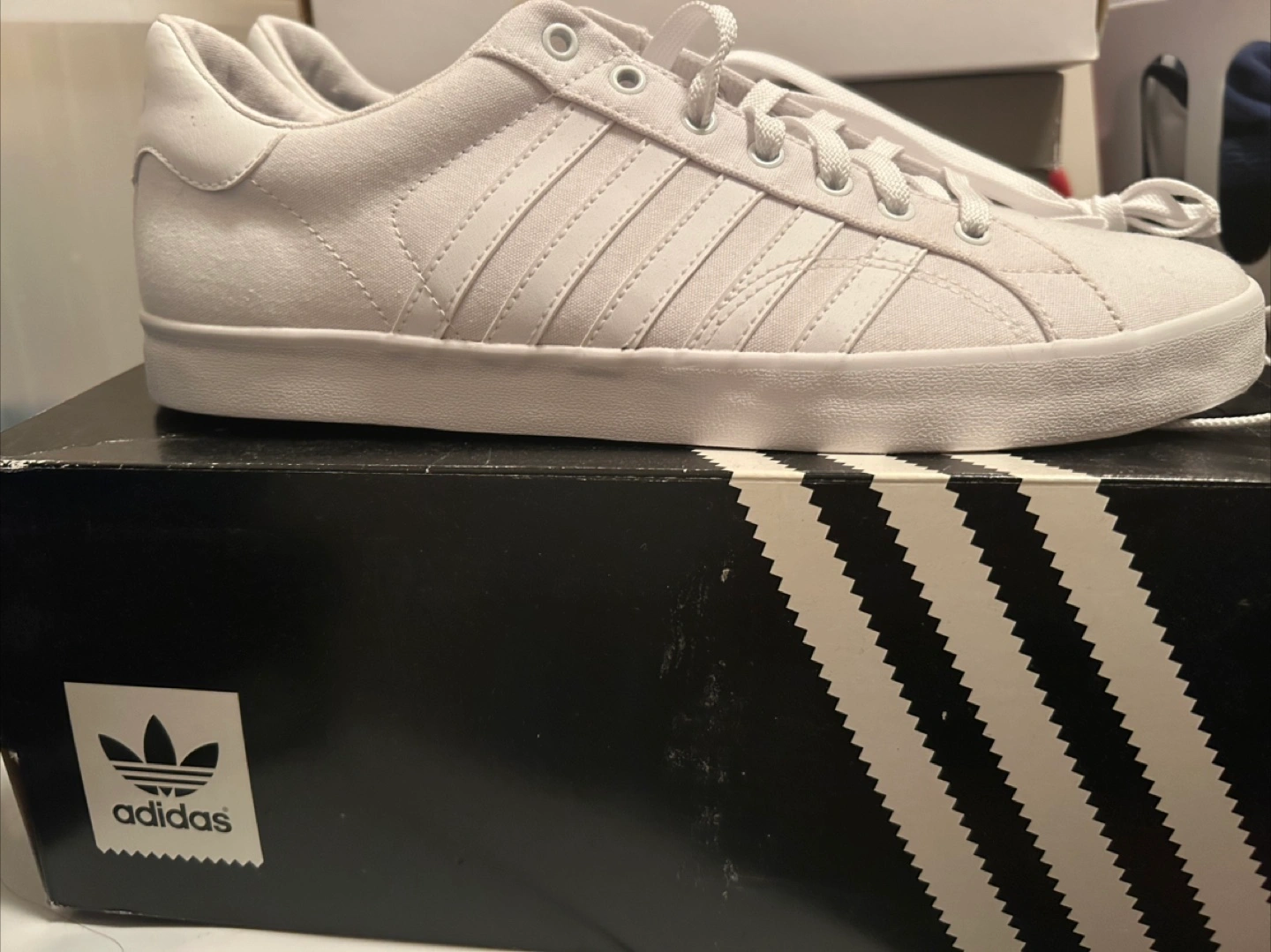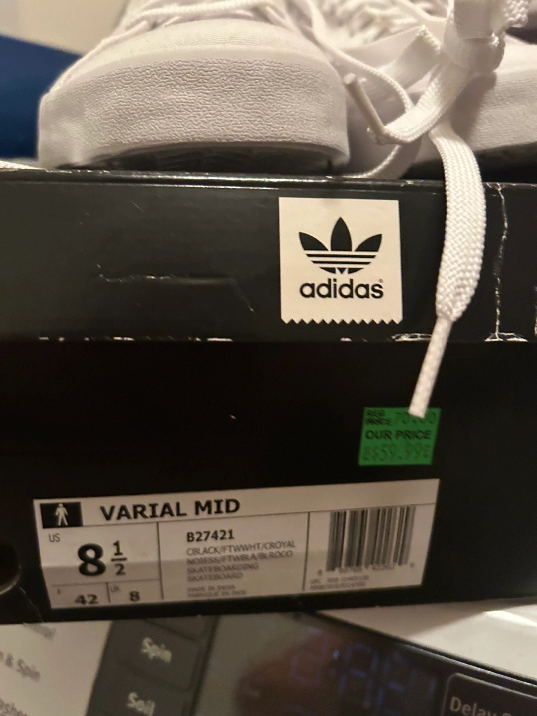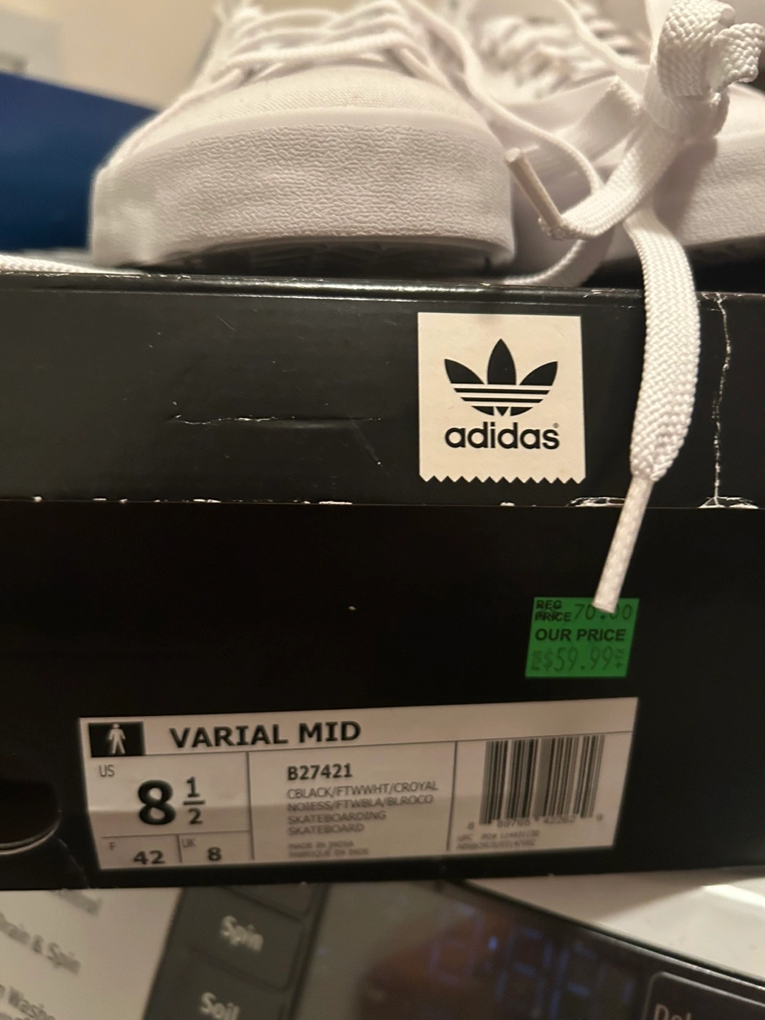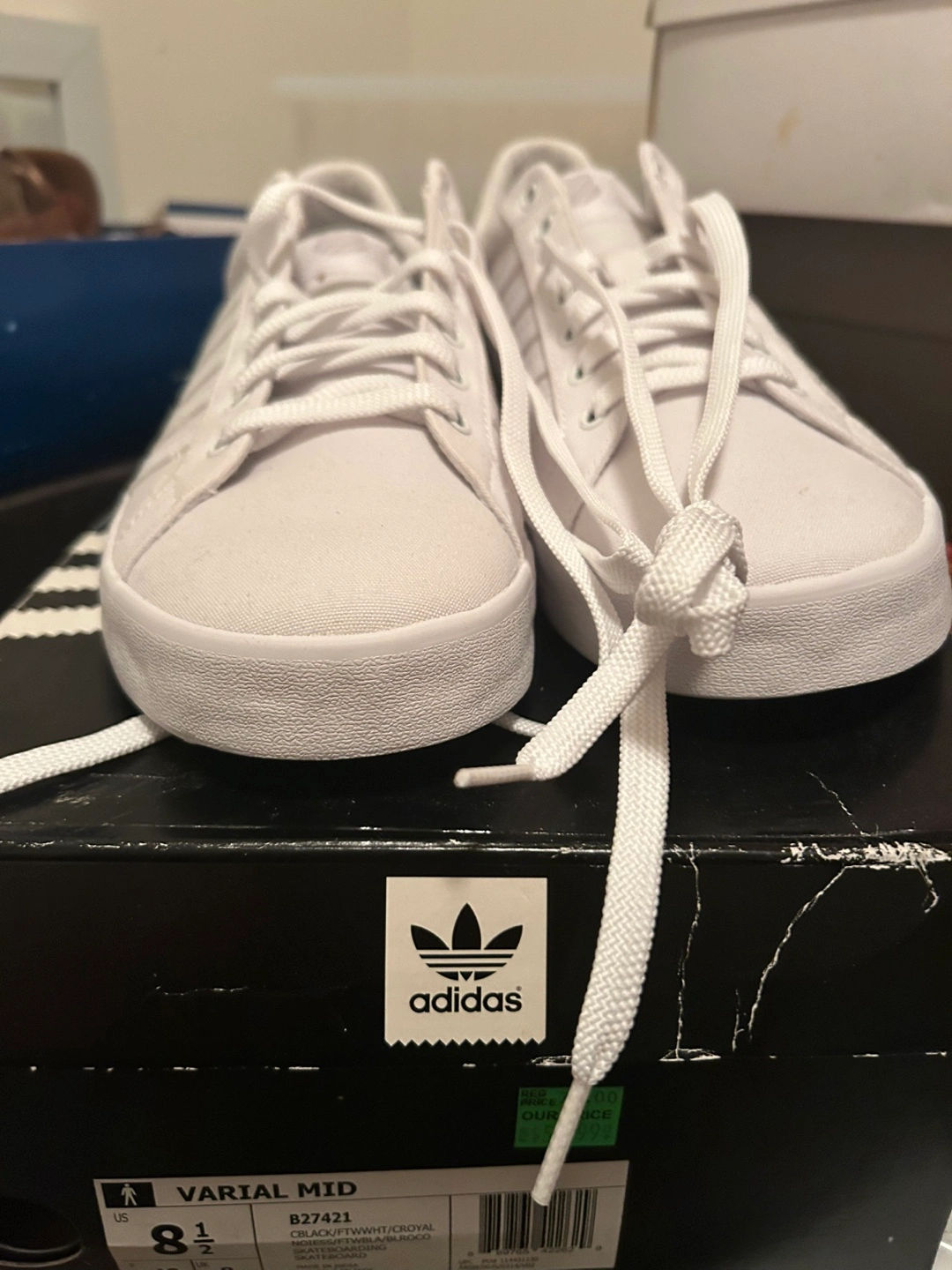 Selling a pair of Adidas Varial Mid sneakers in white! They are size 8.5 US. The box is included. Originally priced at $59.99