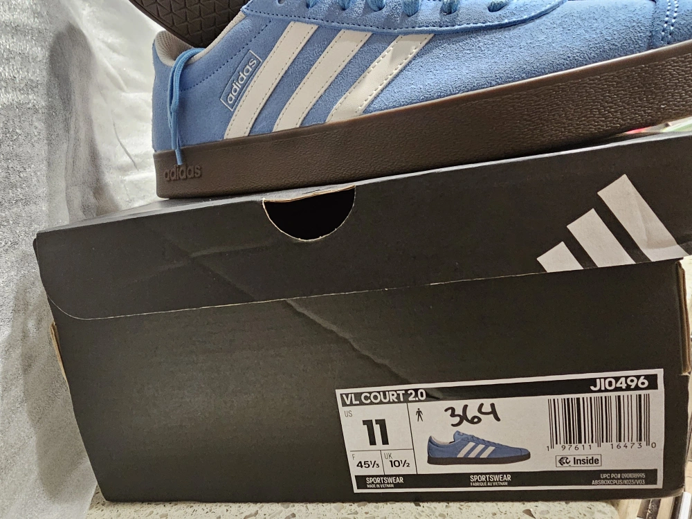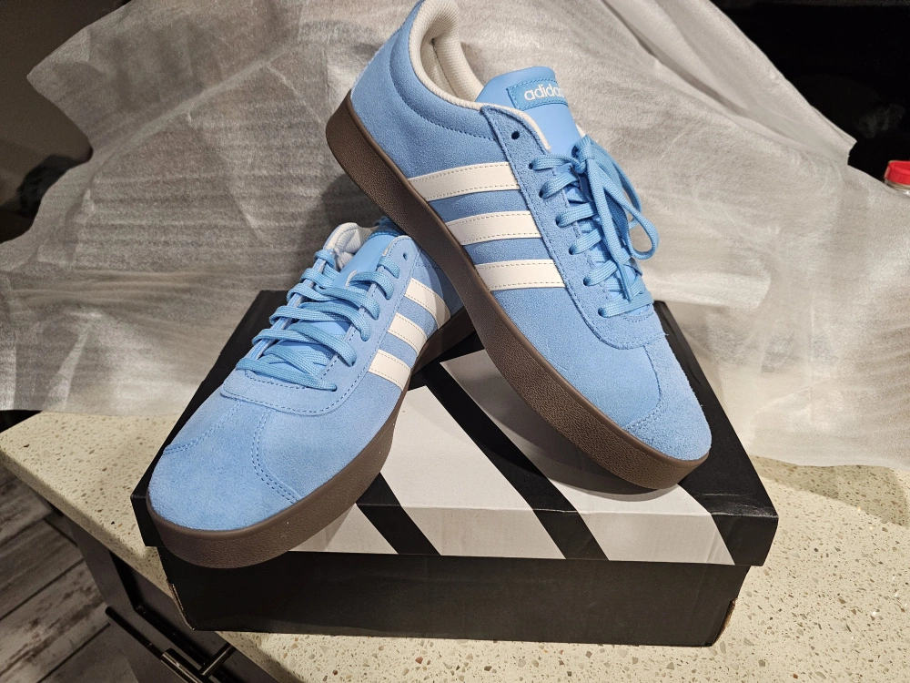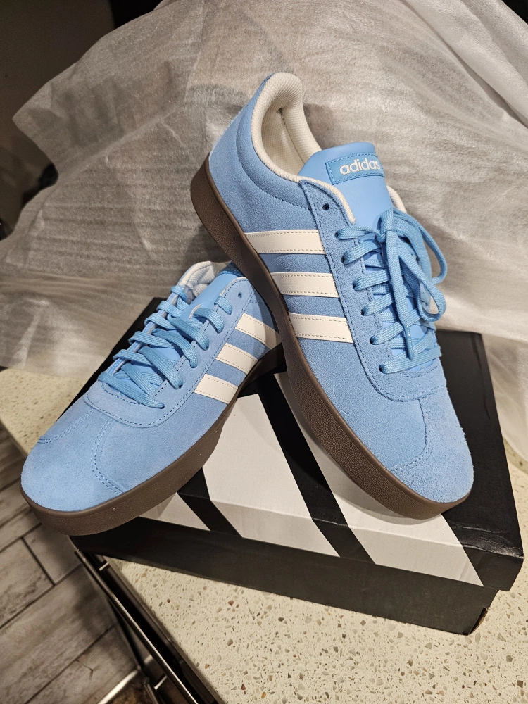 Selling a pair of Adidas VL Court 2.0 sneakers in light blue! They are a size 11 US. The shoes feature the classic three white stripes and a brown sole. Comes with the original box!