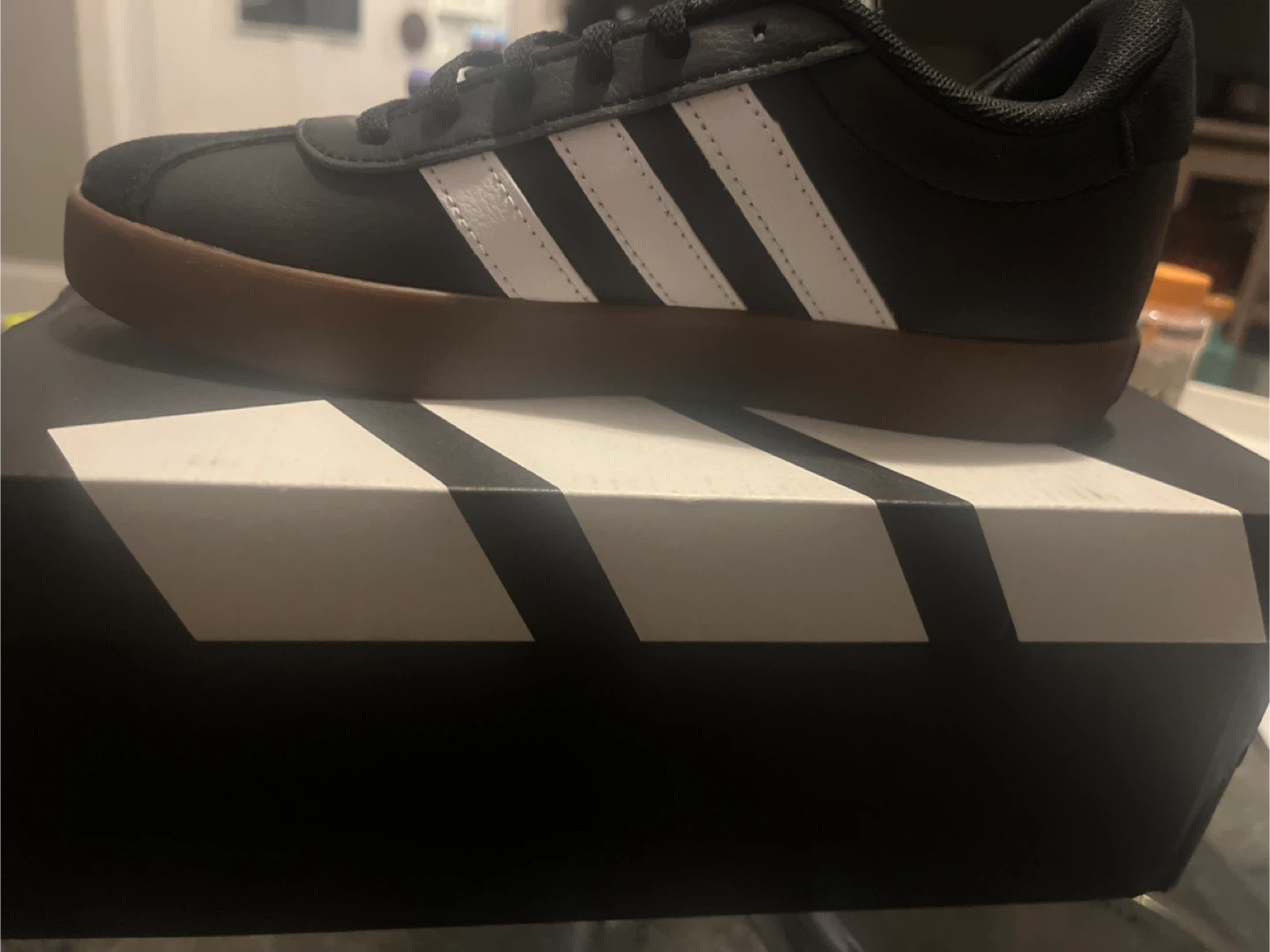 75Selling a pair of Adidas VL Court 3.0 K skateboarding shoes. They are a US size 4. The shoes are black with white stripes and a brown sole. Comes with the original box!