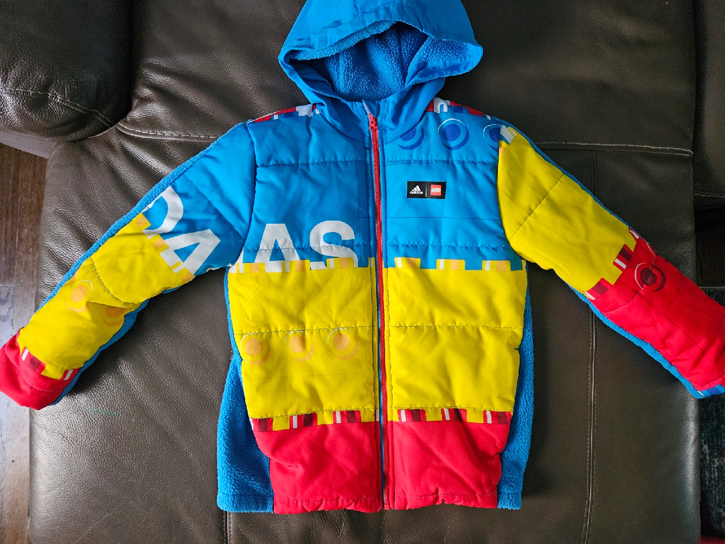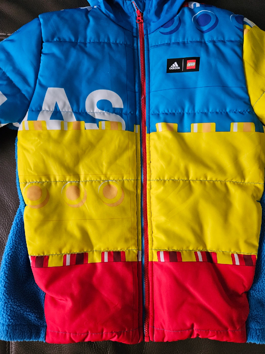 36Selling a colorful Adidas x Lego padded jacket for kids! It features a playful design with Lego brick patterns in blue, yellow, and red. Perfect for keeping your little one warm and stylish.