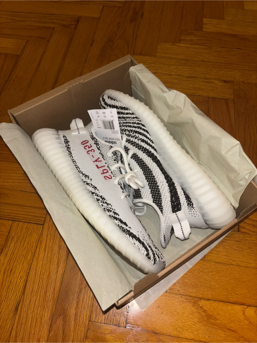 Selling a pair of Adidas Yeezy Boost 350 V2 in the Zebra colorway. They come with the original box. The size is US 10.