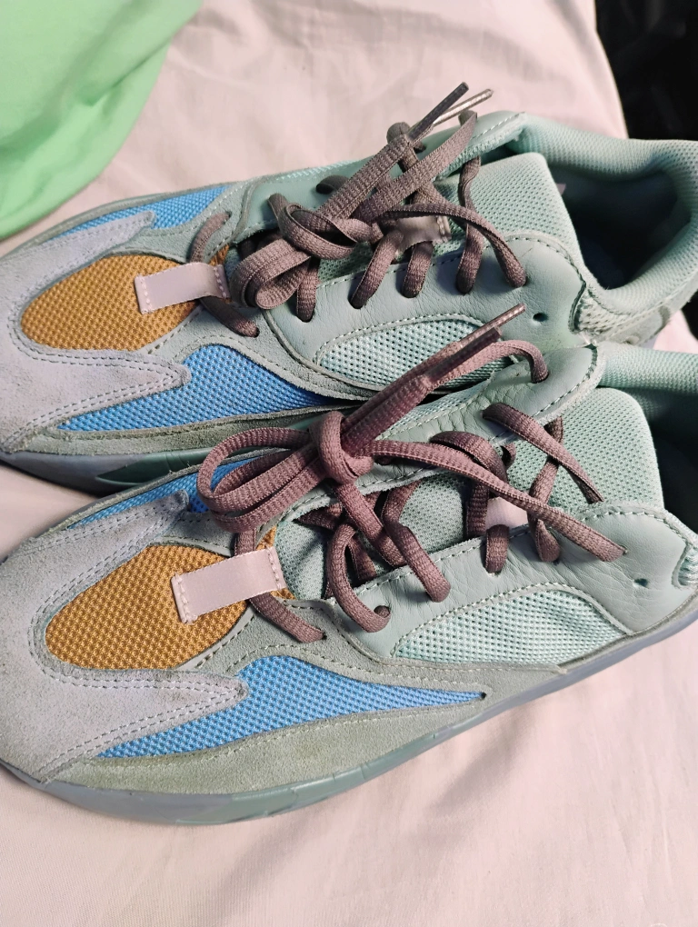 60Selling a pair of Adidas Yeezy Boost 700 in the Faded Azure colorway. These are a US size 9, UK size 8 1/2, and FR size 42 2/3. The shoes feature a tonal blue upper with layers of mesh, suede, and leather, accented with blue and tan mesh inserts, reflective details, and a dark blue Boost midsole. The shoes were originally released in November 2021.