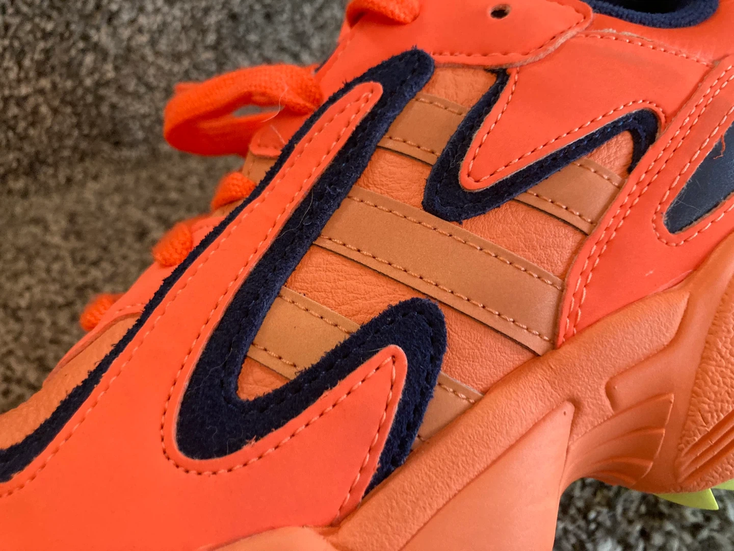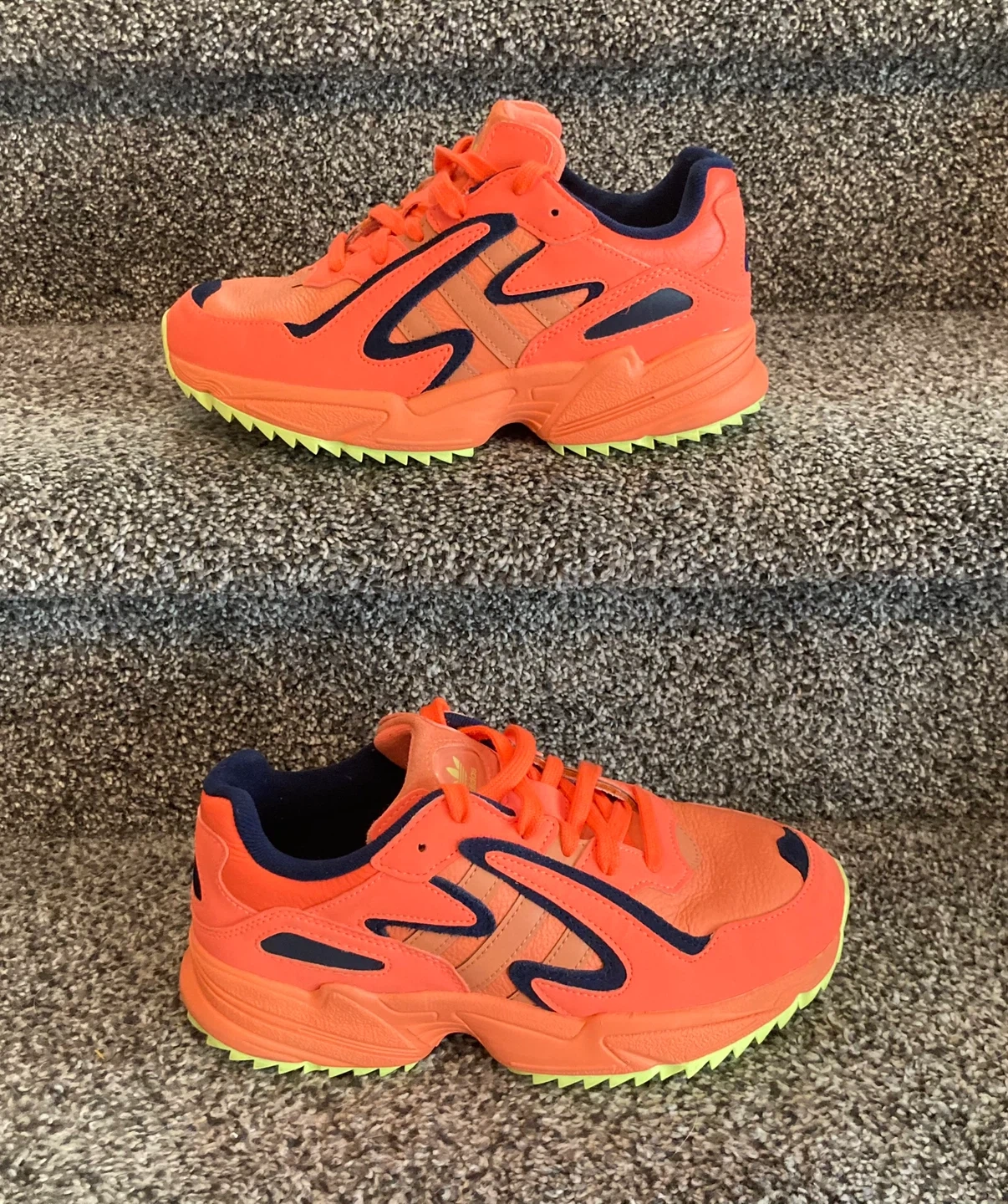 Selling a pair of Adidas Yung-96 Chasm sneakers in orange with navy blue accents! They have a unique design and are in good condition. The soles have a bit of yellow-green detailing that adds a pop of color