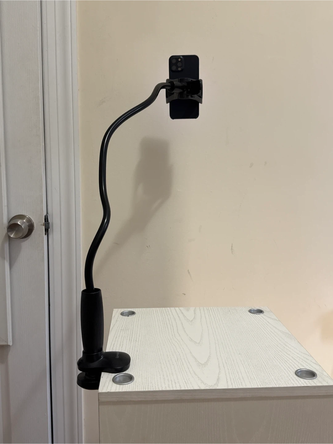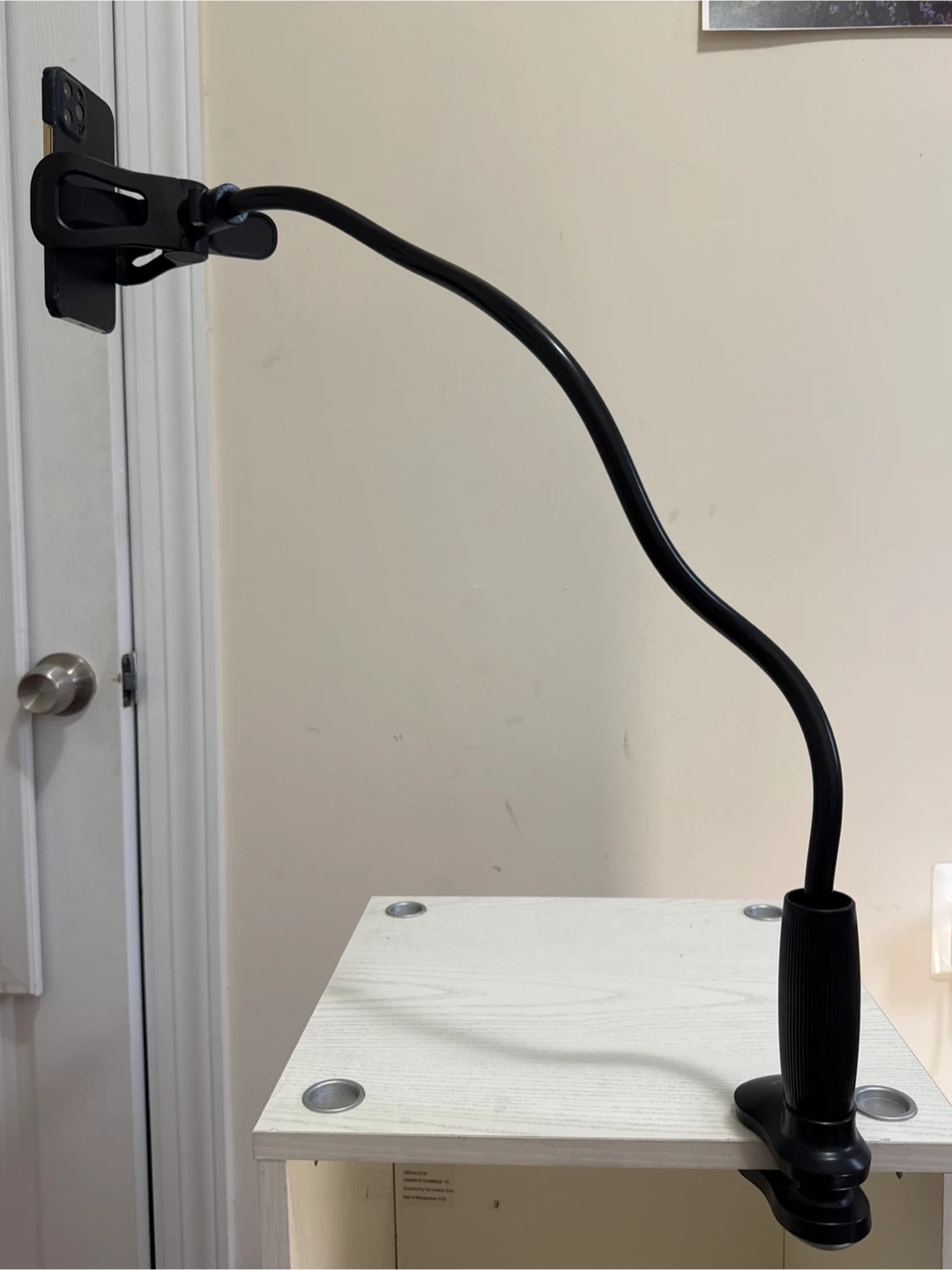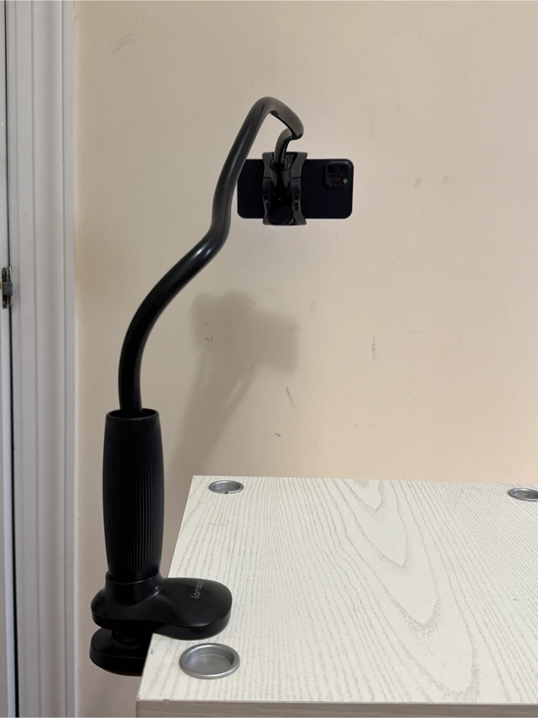Enjoy hands-free comfort with this black adjustable gooseneck phone holder. * Suitable for all phones (4-7 inches) * Clips securely to desks, tables, and nightstands * Flexible neck for perfect viewing angles * Great for YouTube, Zoom, TikTok, FaceTime, or video calls * Excellent condition, sturdy and durable * Perfect for home, office, or travel. ***Phone is for display only***