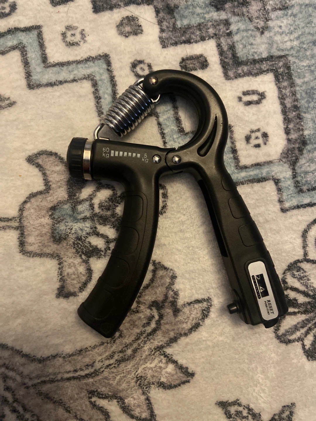 25I'm selling an adjustable hand grip strengthener! It looks like it's in great condition. It's black and has a digital counter to keep track of your reps. It can be adjusted from 5 kg to 60 kg