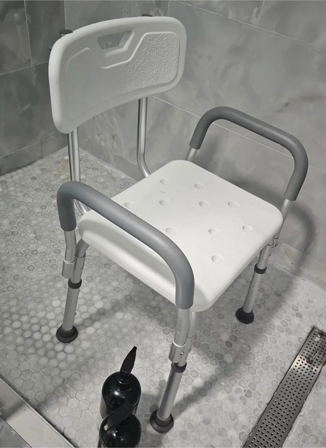 Selling a shower chair with adjustable height legs. It has a back and armrests for extra support. The seat is white and the frame is silver. Great for anyone who needs a little extra help in the shower