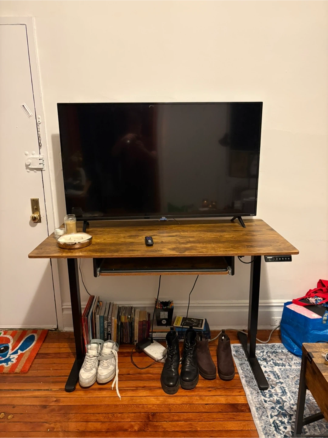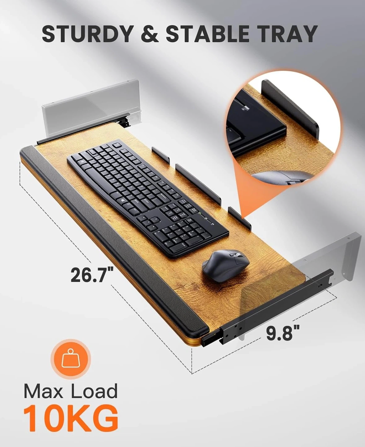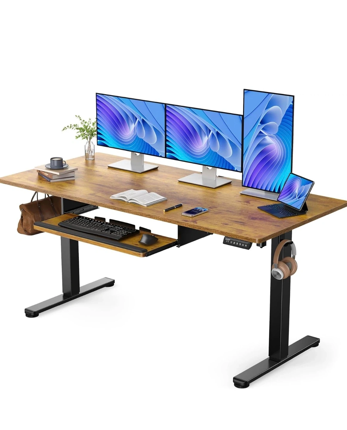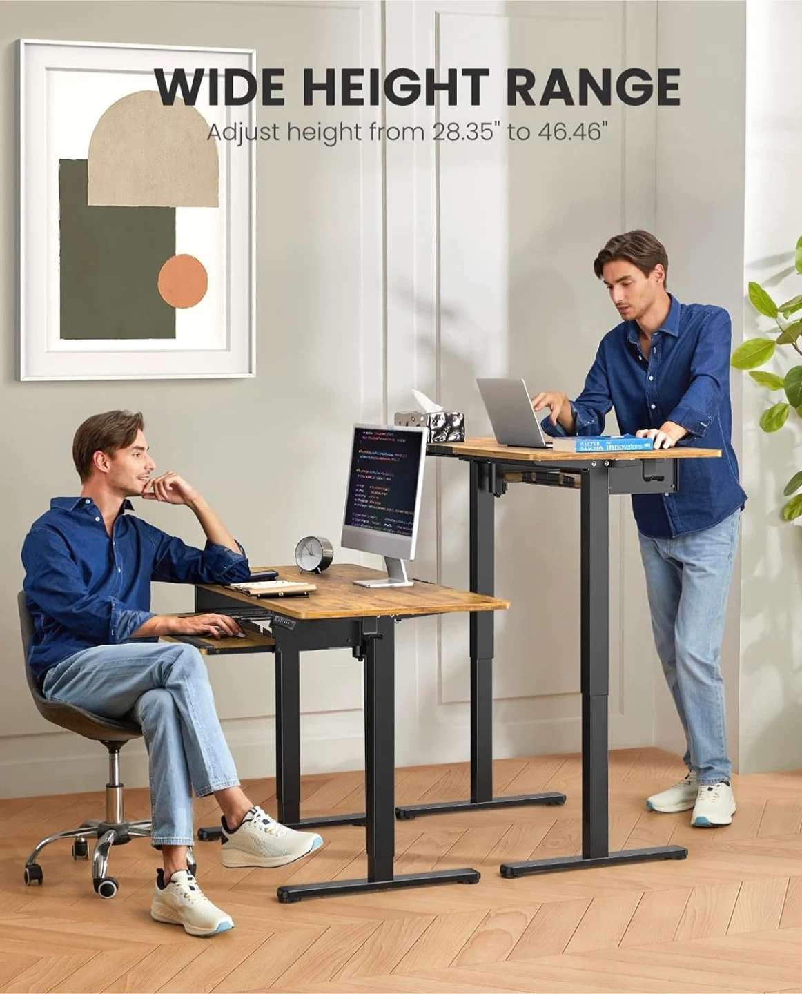Selling a height-adjustable standing desk. It has a wide height range, adjustable from 28.35" to 46.46". The desk also features a sturdy and stable keyboard tray measuring 26.7" x 9.8". Great for creating an ergonomic workspace
