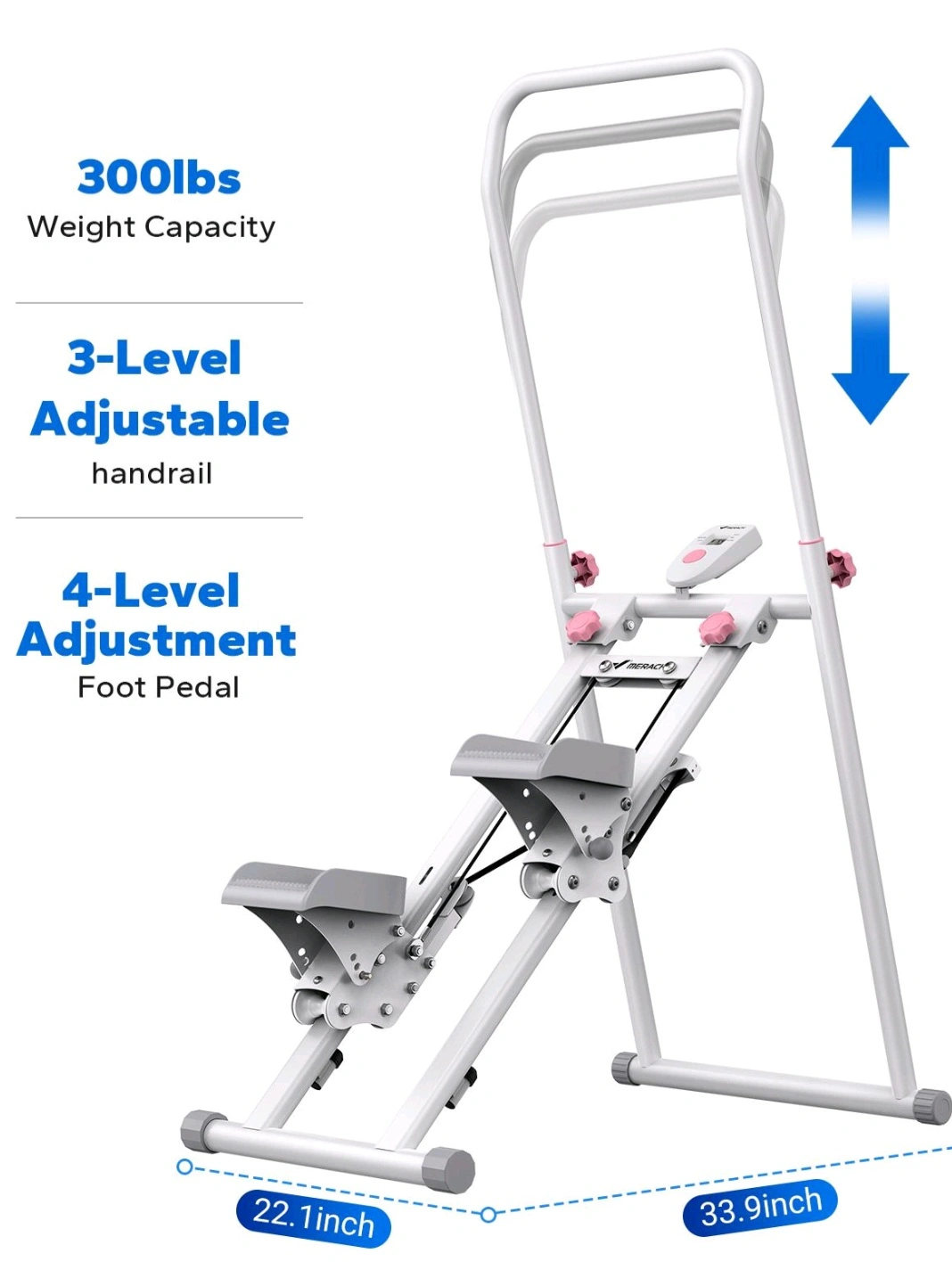 65Adjustable mini stepper in perfect condition! It features a 3-level adjustable handrail and a 4-level adjustable foot pedal. It also has a 300lbs weight capacity. The dimensions are 22.1 inches by 33.9 inches