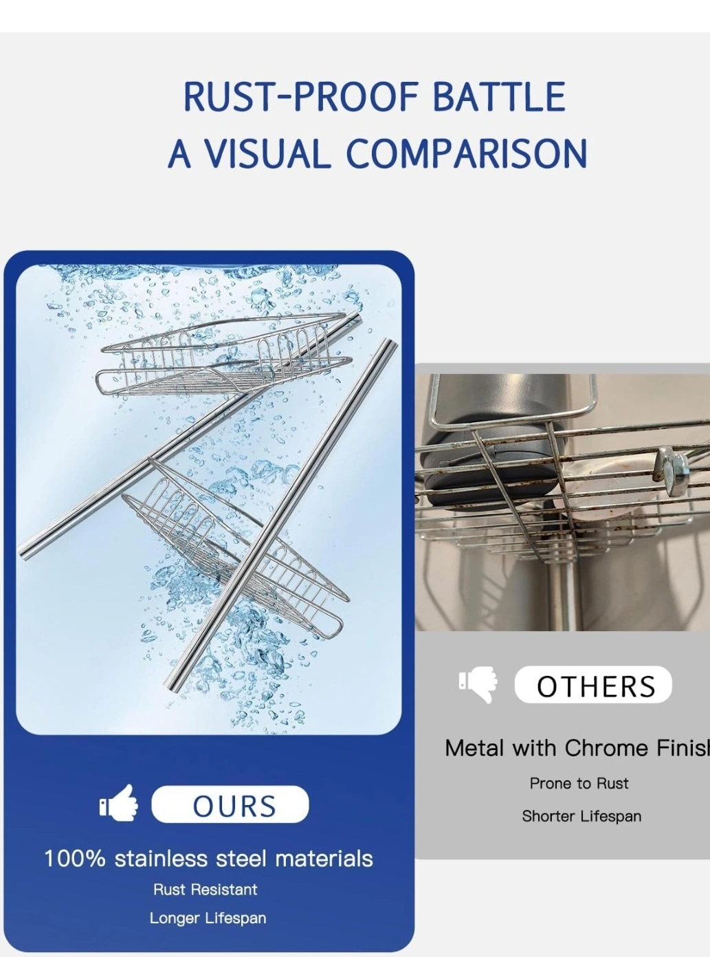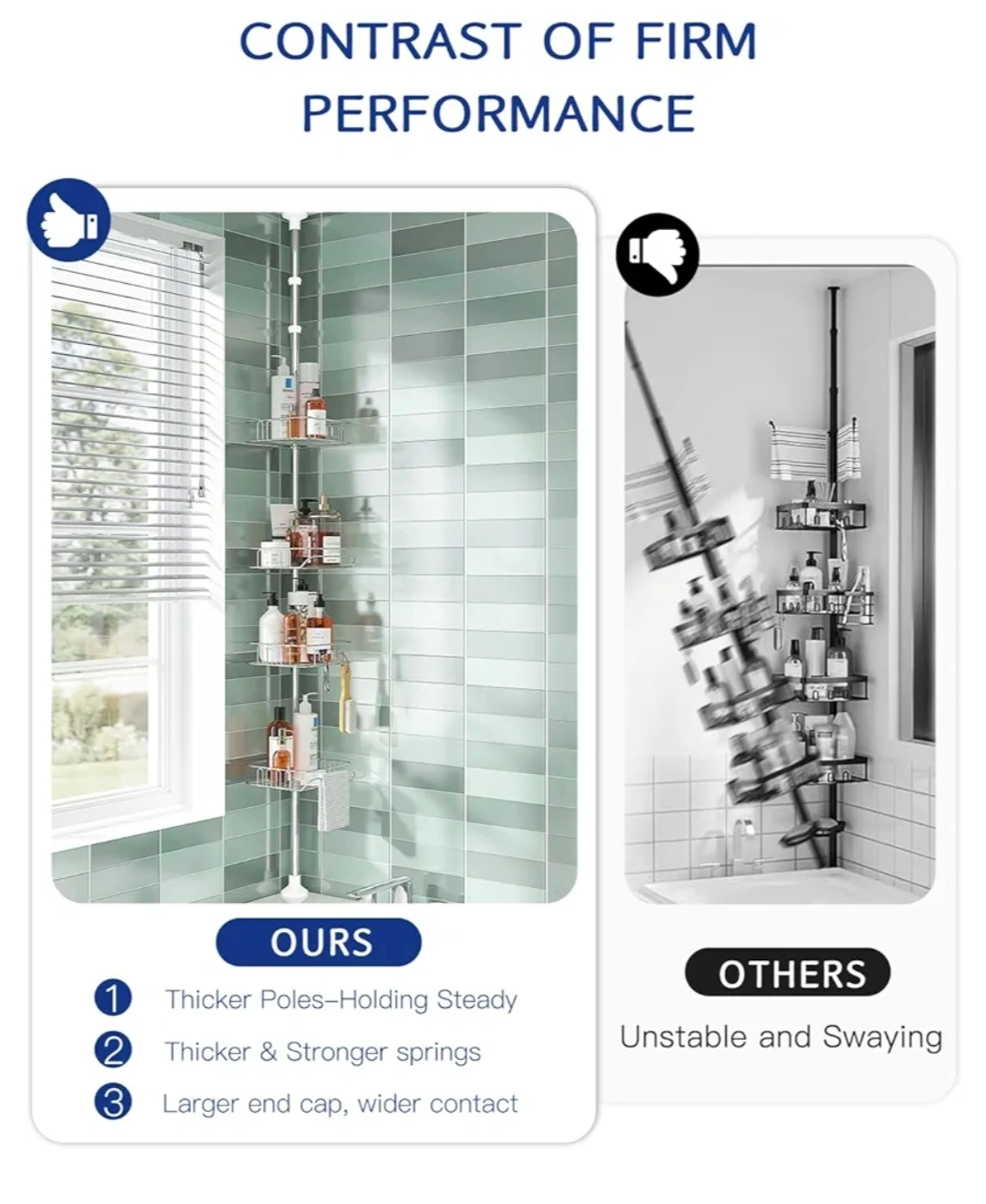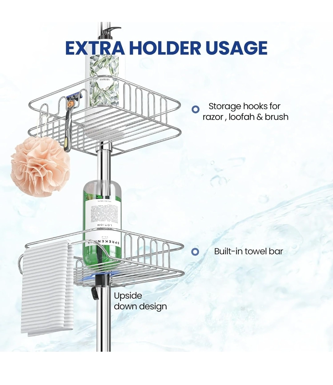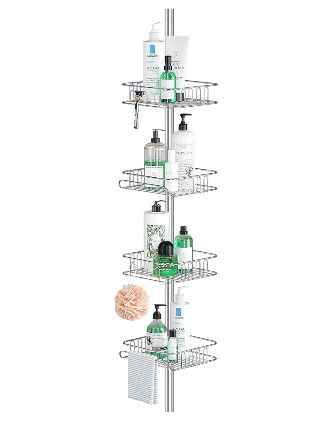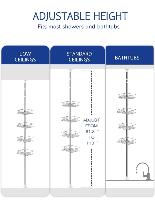 202This shower caddy is adjustable in height to fit most showers and bathtubs. It features multiple shelves for storage, as well as a built-in towel bar. It is made from stainless steel and is rust-resistant.