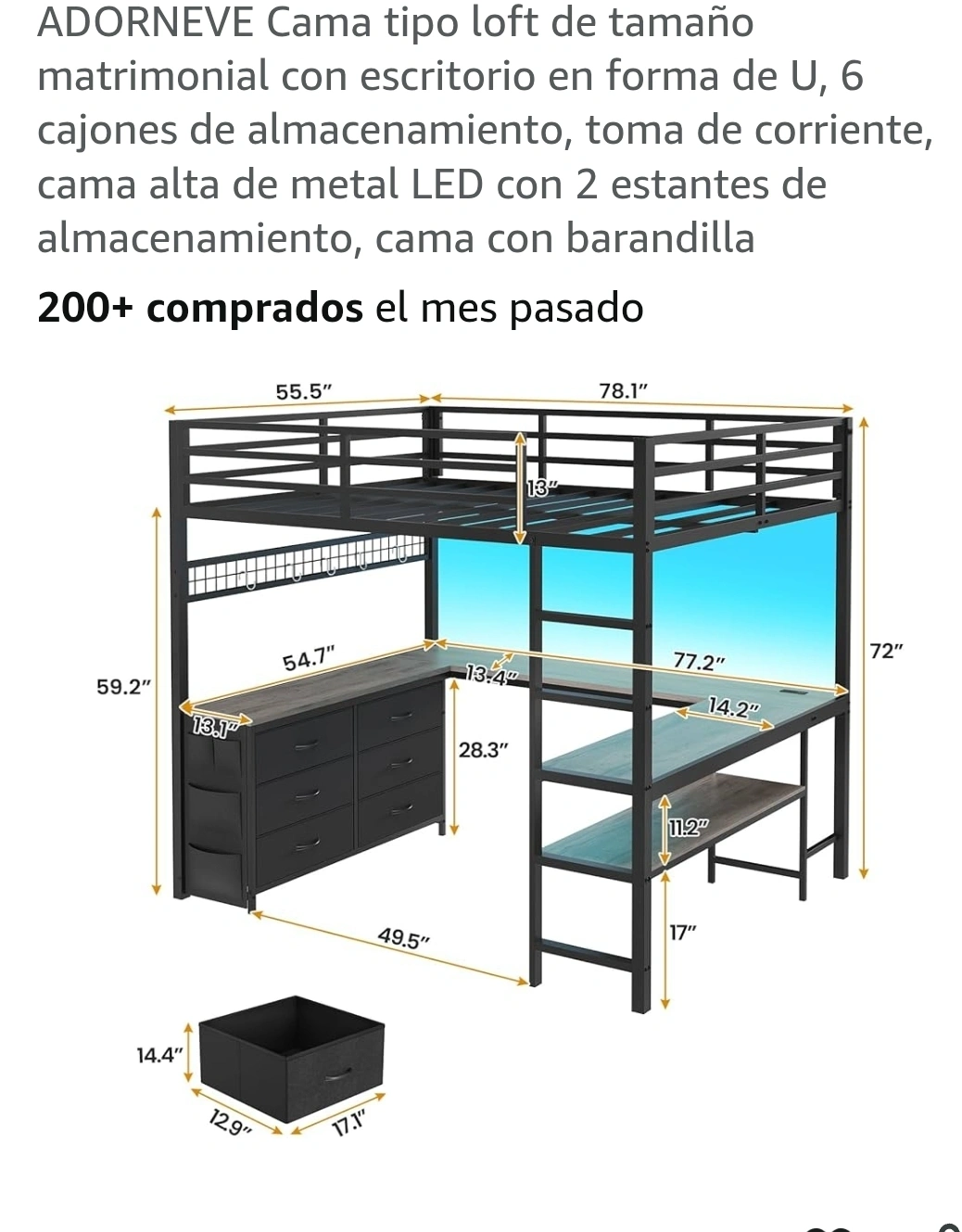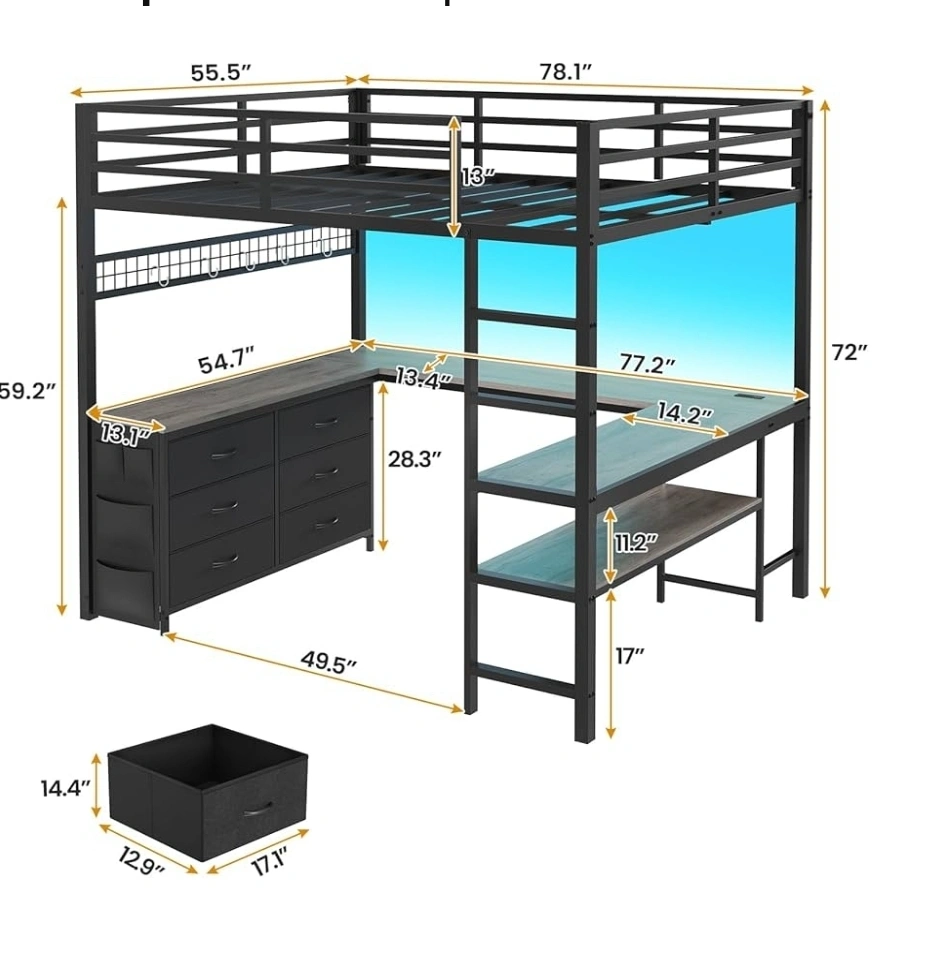 Selling an ADORNEVE loft bed featuring a U-shaped desk! This bed comes with a desk, 6 drawers for storage, and an LED metal high bed with 2 storage shelves and a guardrail. Perfect for maximizing space!. ADORNEVE Cama tipo loft de tamaño matrimonial con escritorio en forma de U, 6 cajones de almacenamiento, toma de corriente, cama alta de metal LED con 2 estantes de almacenamiento, cama con barandilla