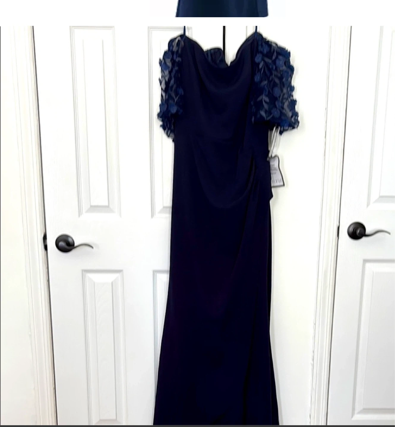 Beautiful Adrianna Papell gown in navy blue! It has a lovely design and is perfect for a special occasion. The dress is in great condition and ready for a new home