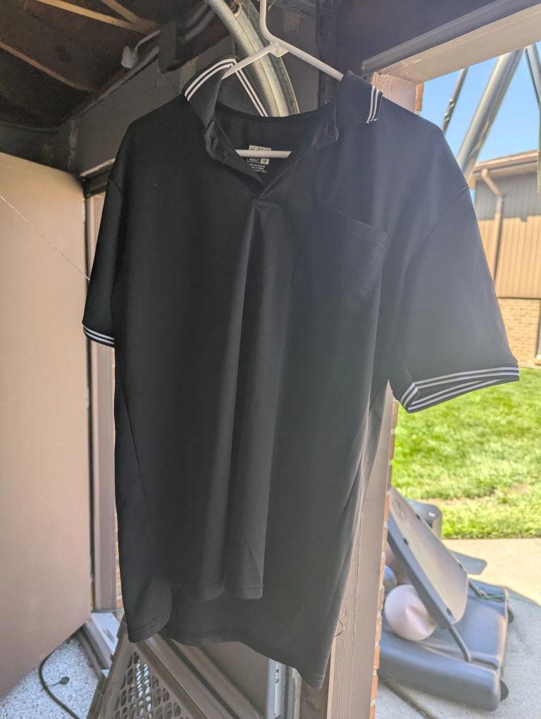 I'm selling a black adult polo shirt in size M. It's in great condition and features a stylish design with white stripes on the collar and sleeves. Perfect for sports or casual wear!