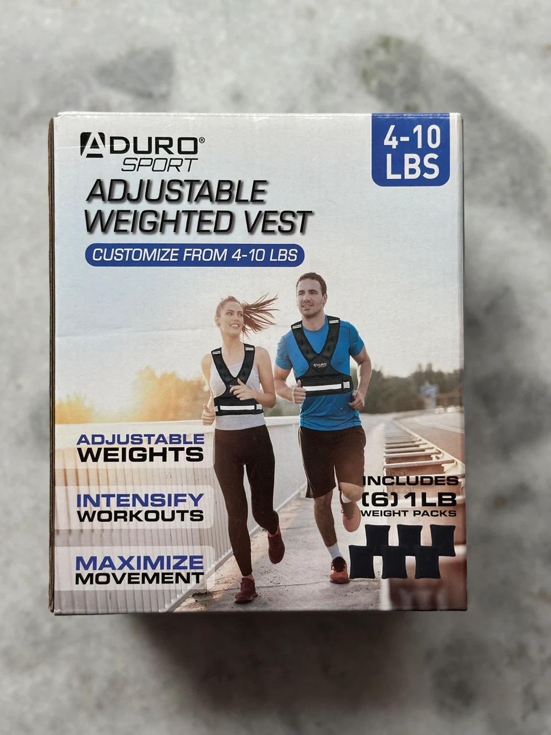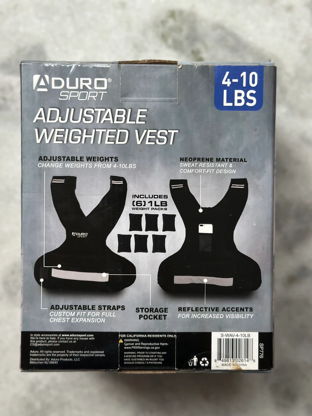 Selling a brand new Aduro Sport adjustable weighted vest! It's adjustable from 4-10 lbs and comes with (6) 1lb weight packs. The vest features adjustable straps, a storage pocket, and reflective accents. It's made of neoprene material for a sweat-resistant and comfortable fit.