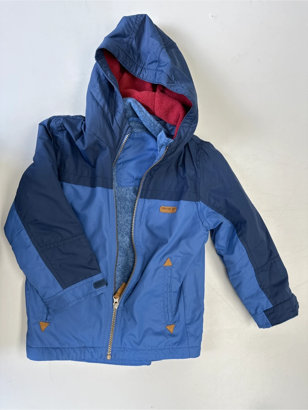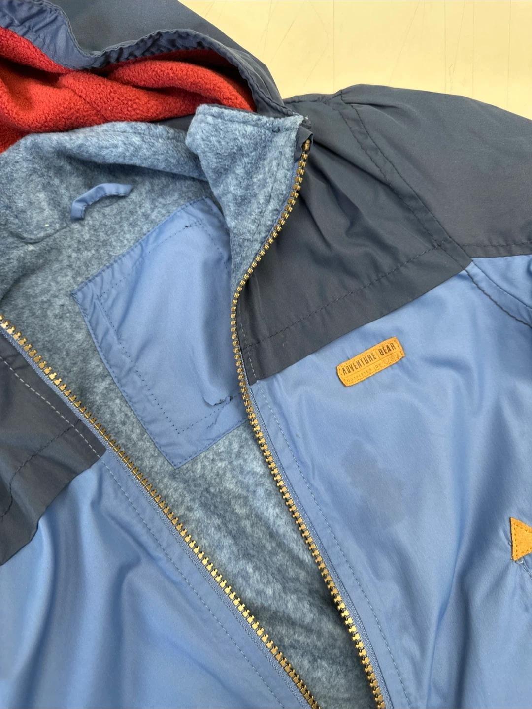 I'm selling an Adventure Bear kids' hooded jacket in blue tones. It features a cozy fleece lining and a full zipper. Perfect for keeping your little one warm and stylish!