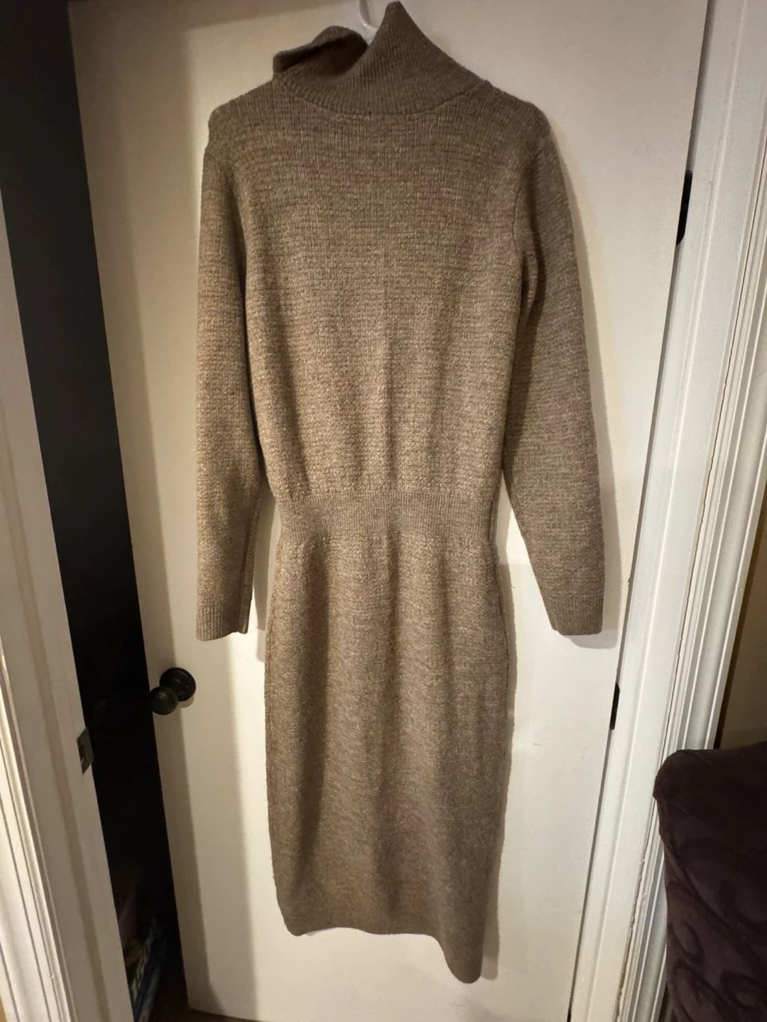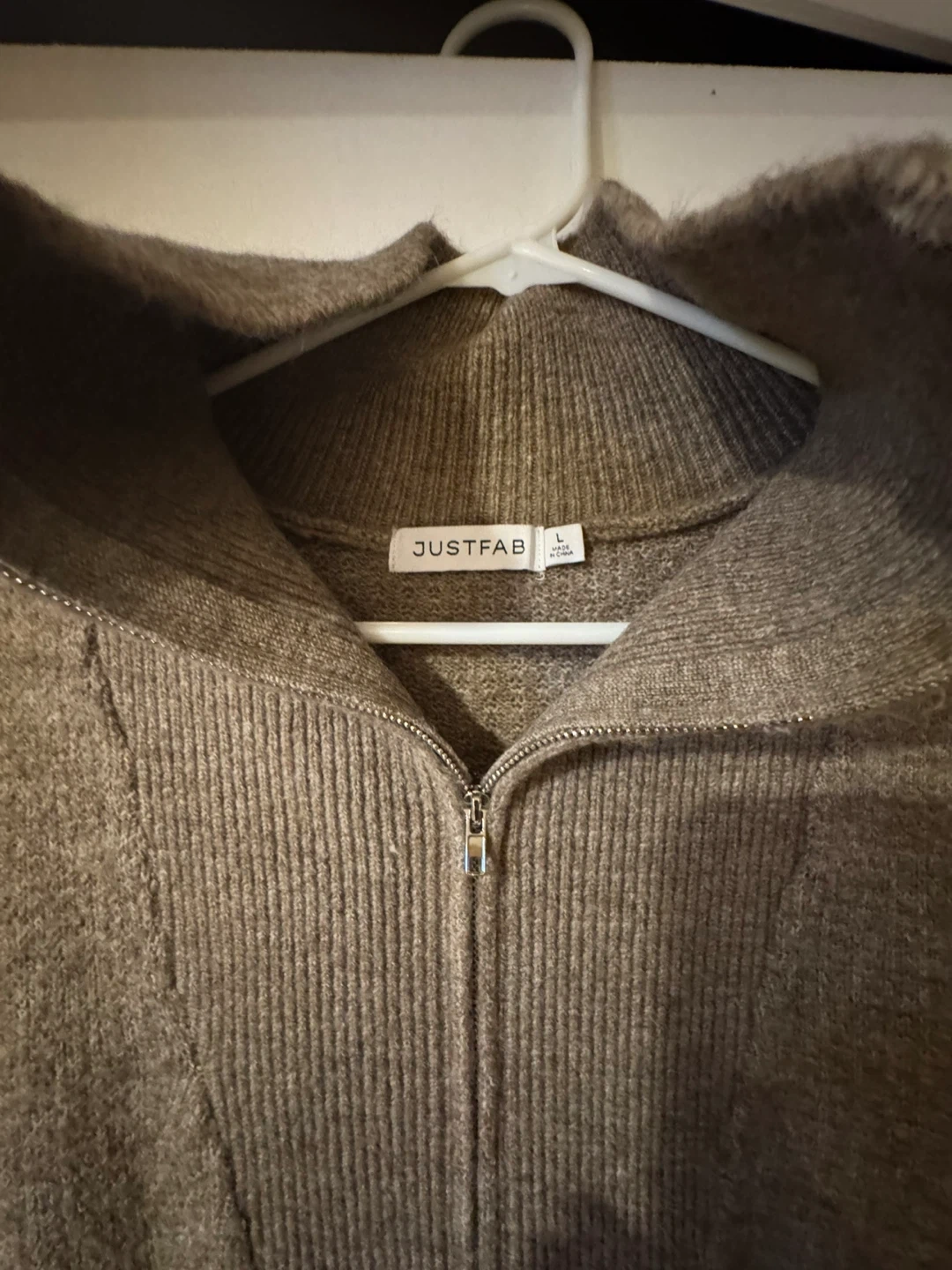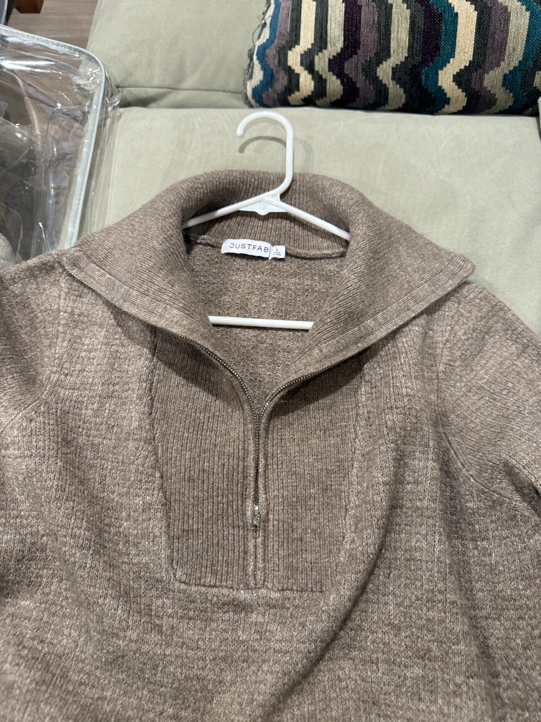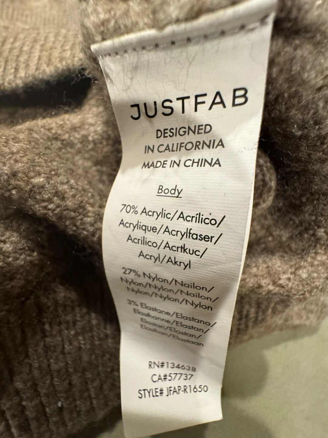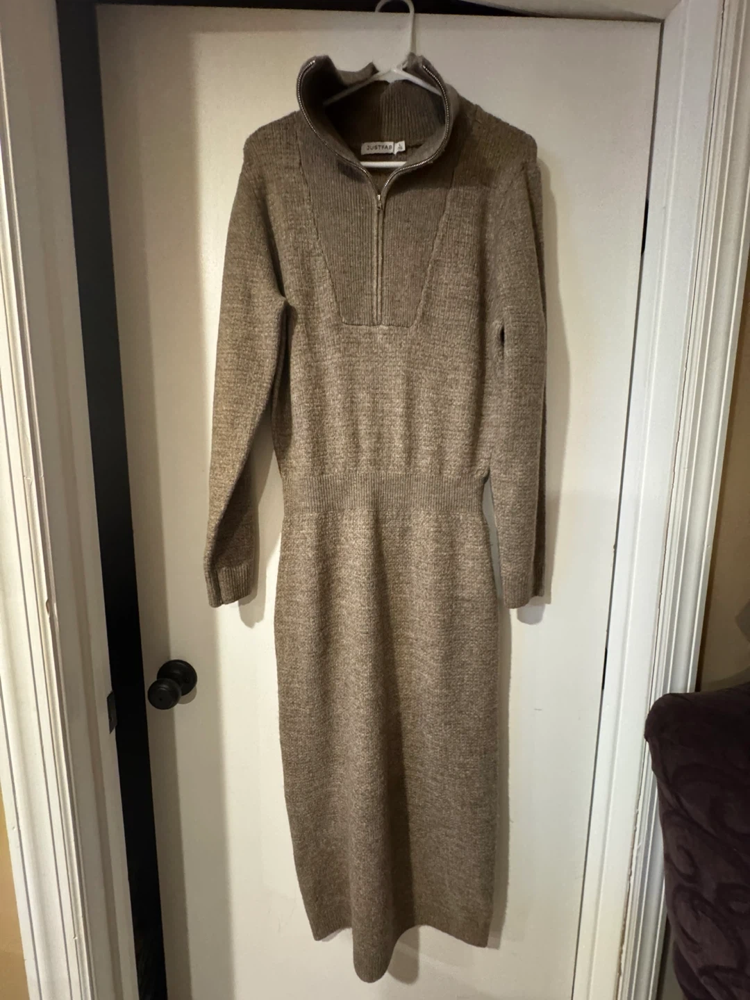 Selling a JUSTFAB brown knit dress in size L. The dress features a 70% Acrylic, 27% Nylon, and 3% Elastane blend. Perfect for a cozy and stylish look!