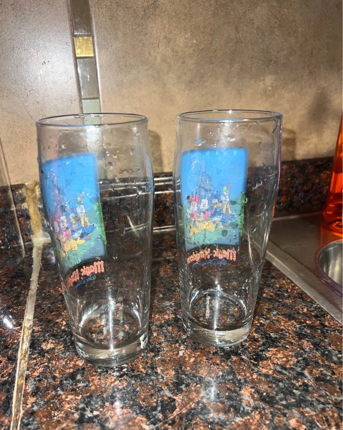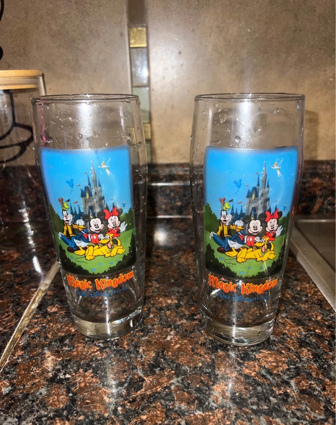 Two Magic Kingdom glasses. Features Mickey Mouse, Minnie Mouse, Goofy, Pluto, and Cinderella Castle. Clear glass with colorful print.