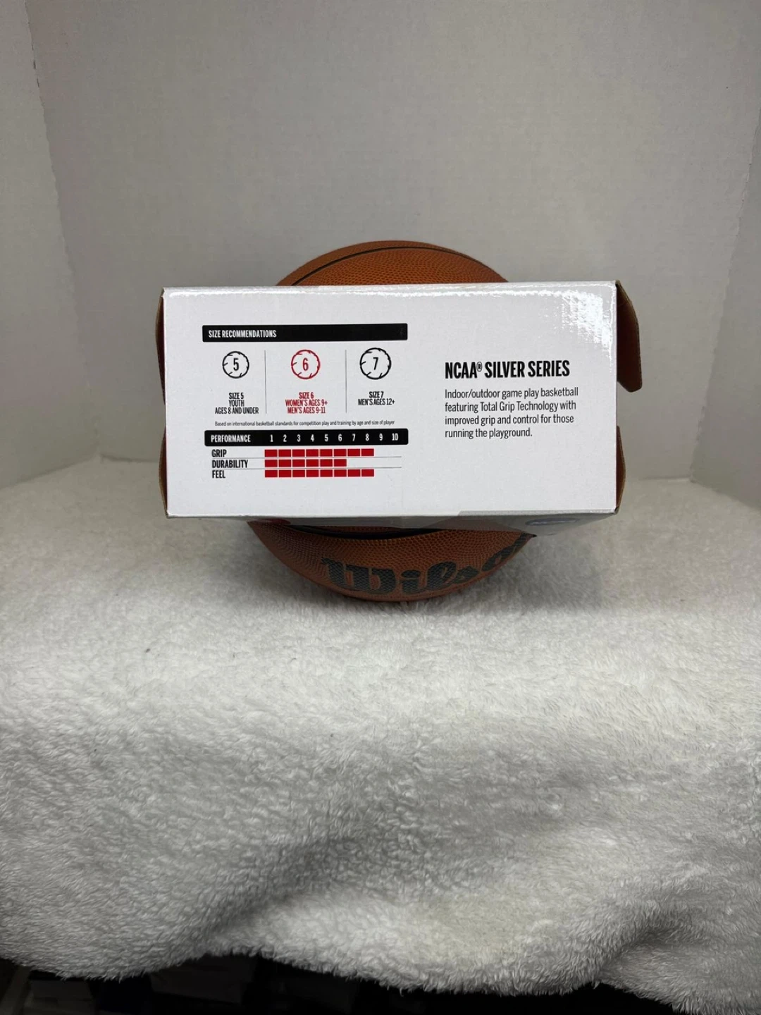 Selling a Wilson NCAA Silver Series basketball, size 6! It's designed for both indoor and outdoor play. Features Total Grip Technology for enhanced control. Perfect for those running the playground