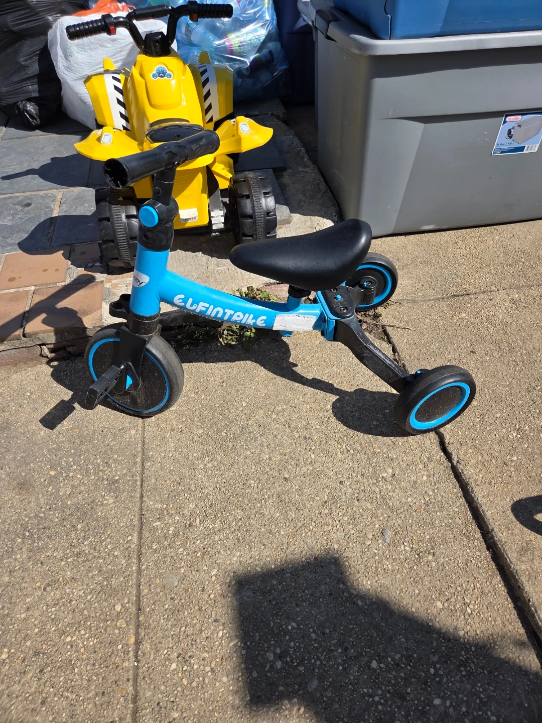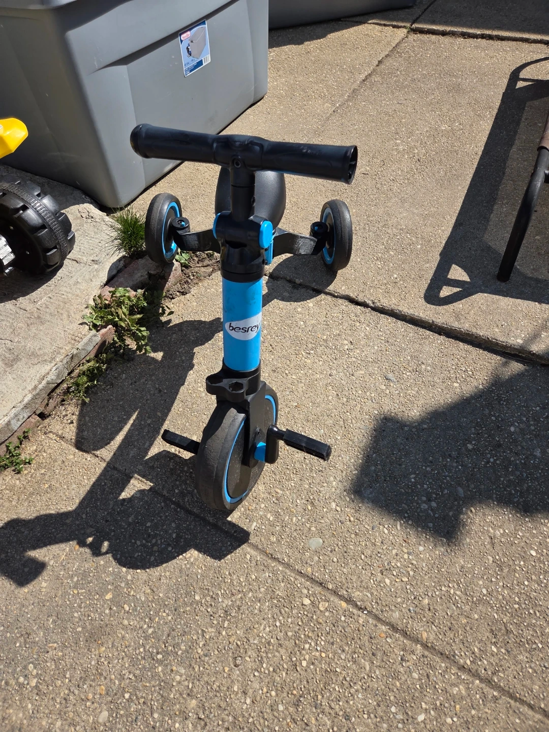 This is a Besrey balance bike for toddlers. It's blue with black handlebars and seat. It has three wheels for stability. It's a great starter bike for little ones learning to balance!