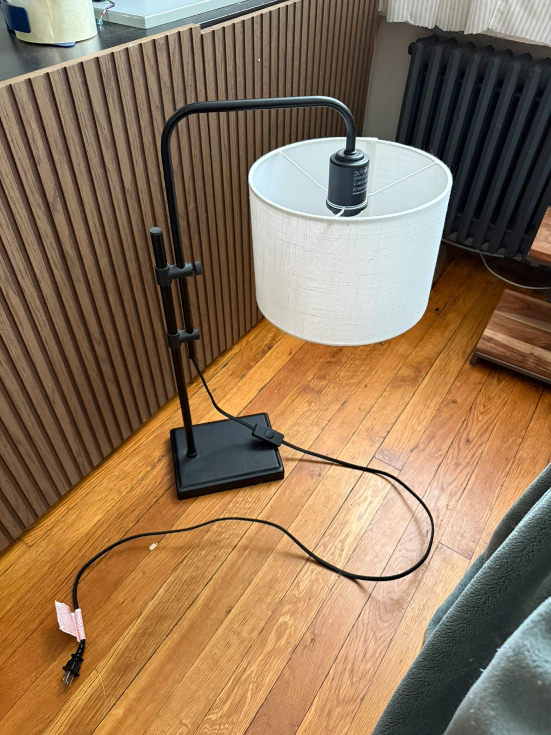 Modern adjustable table lamp from Threshold (Target). Clean, minimalist design with a fabric drum shade and matte black metal base. Arm and shade are adjustable, making it great for a desk, side table, or reading nook.