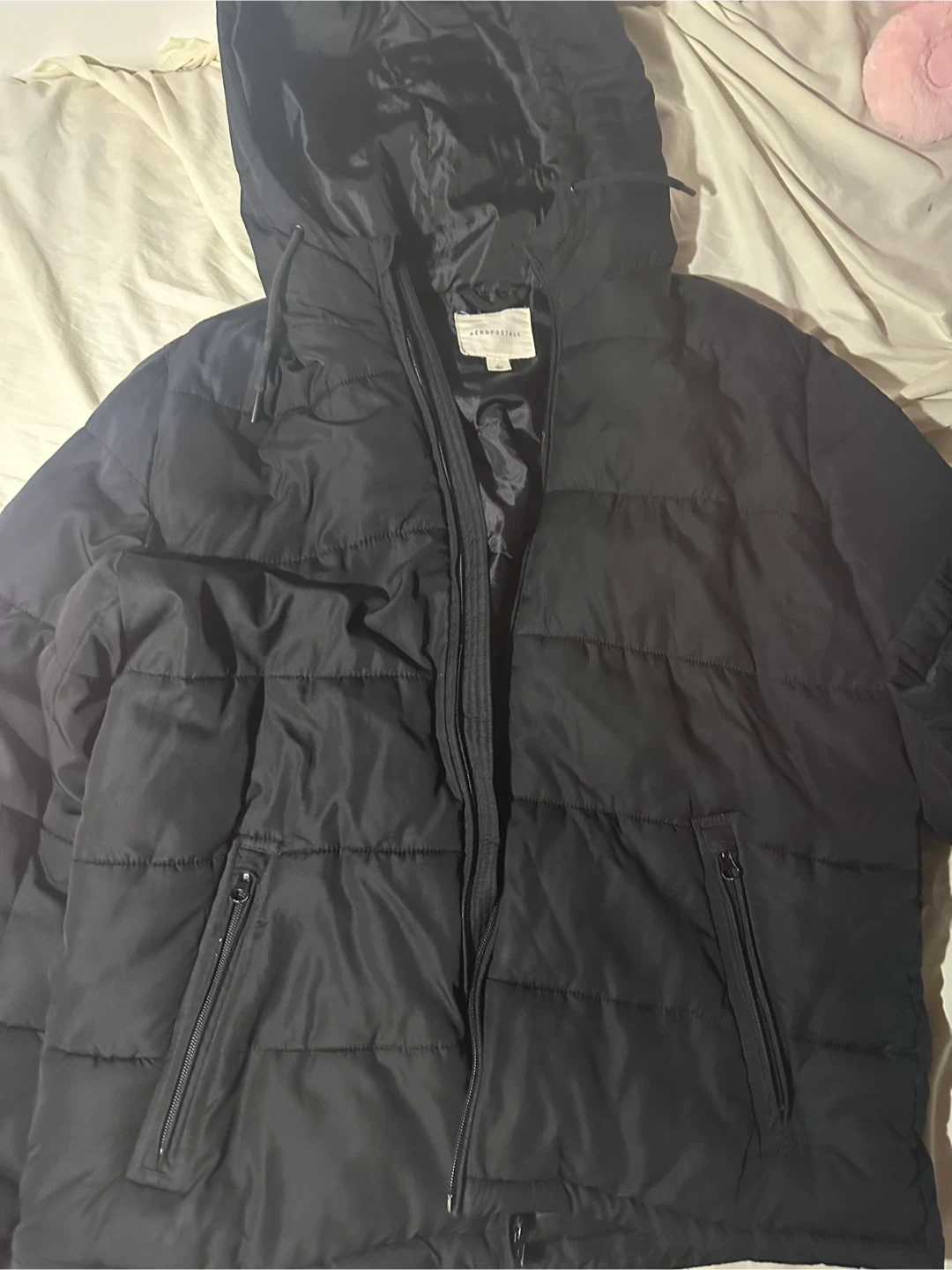 Selling a black Aeropostale puffer jacket in size L. It's in great condition and perfect for staying warm. The jacket features a hood and zippered pockets.