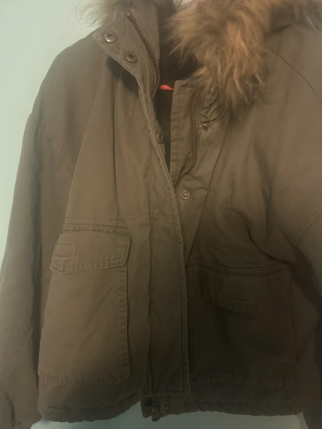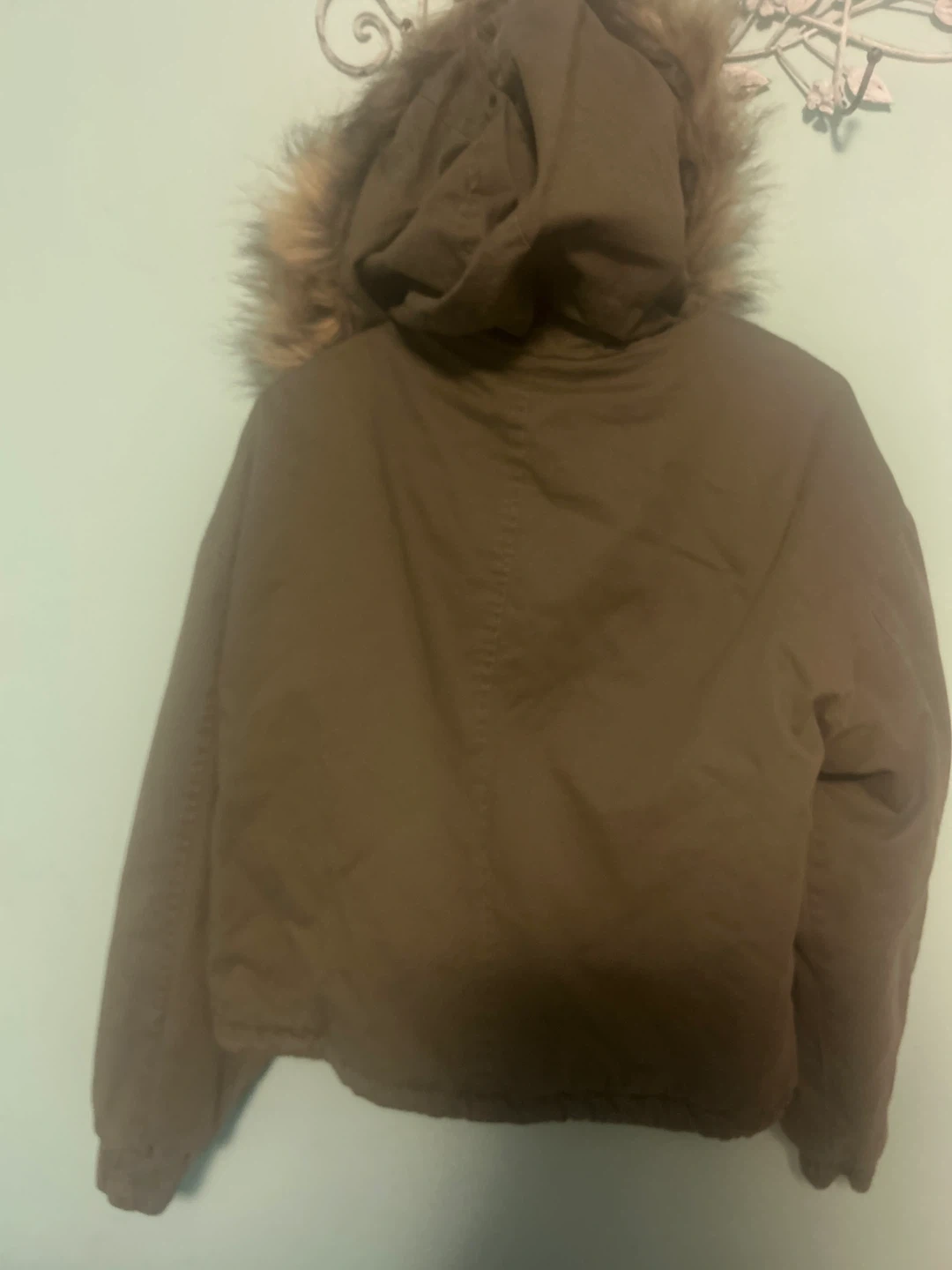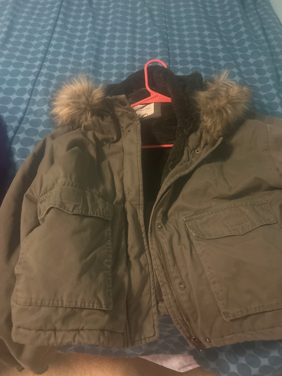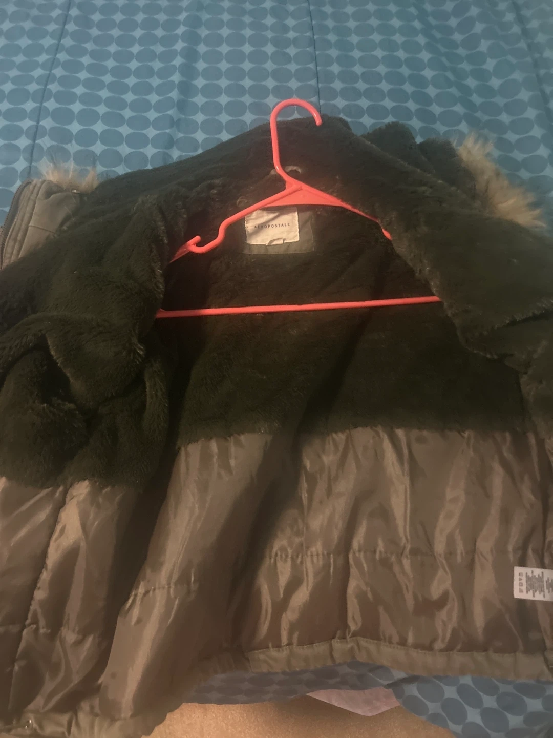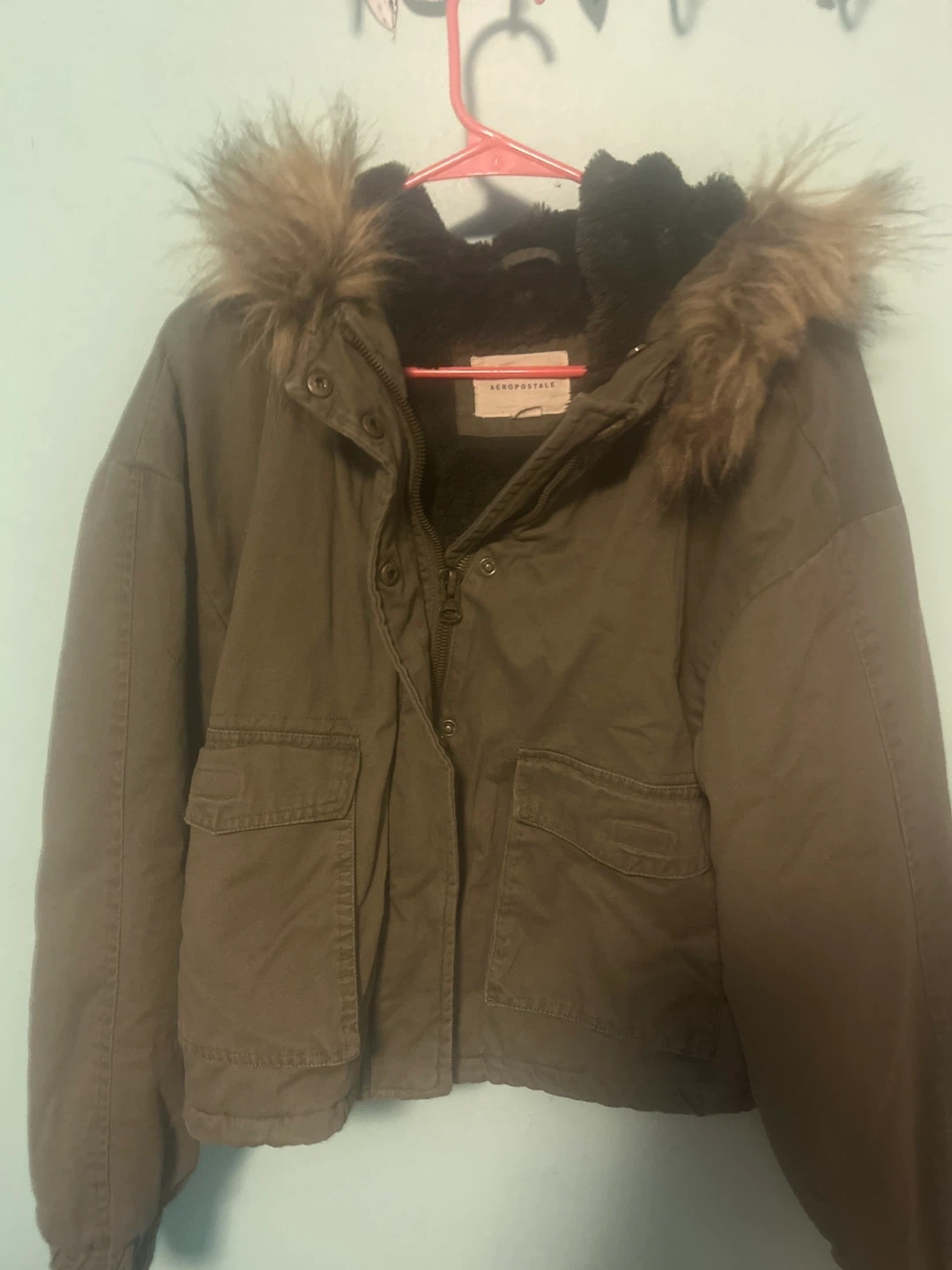 Here's an Aeropostale jacket in olive green! It features a faux fur-trimmed hood and a comfortable lining. Perfect for cooler weather!