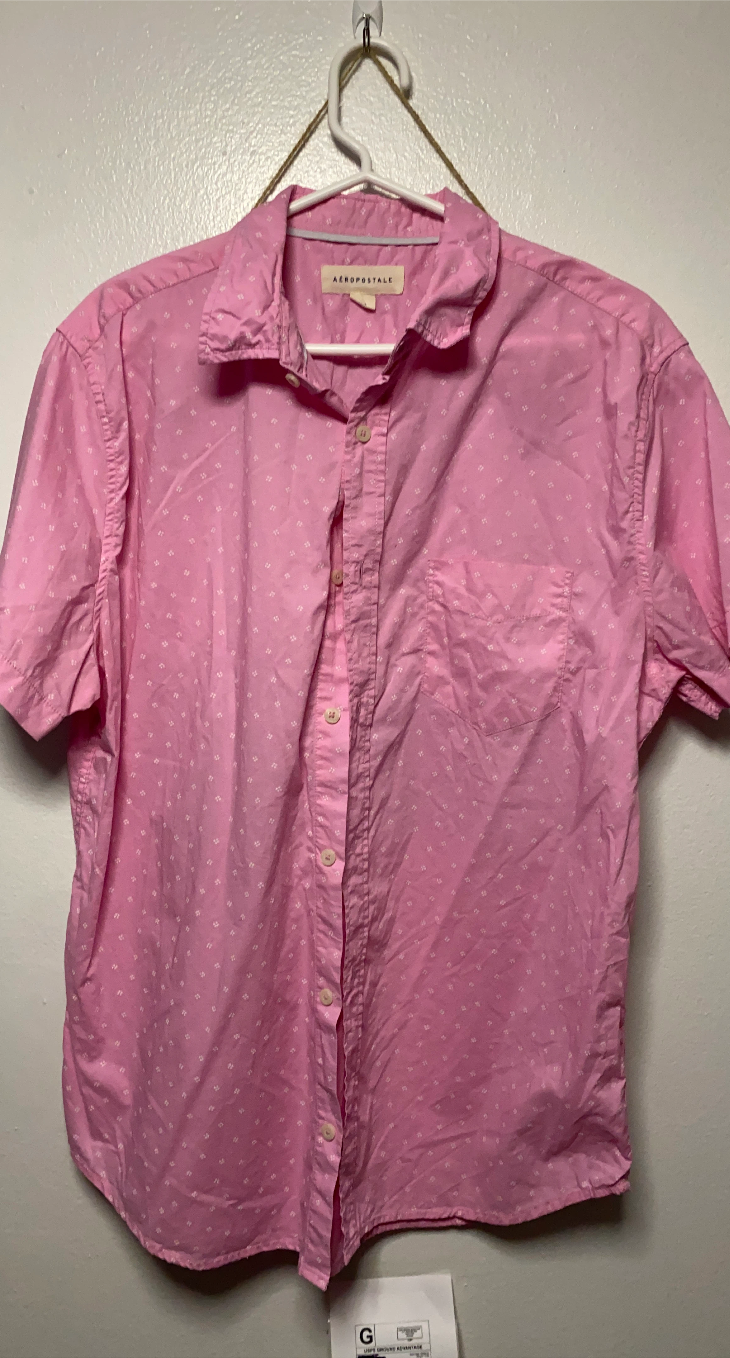 Selling a cute Aeropostale button-down shirt in pink with a subtle white pattern! It's a size large and in great condition. Perfect for a casual look or dressing up a bit. Feel free to reach out if you have any questions!