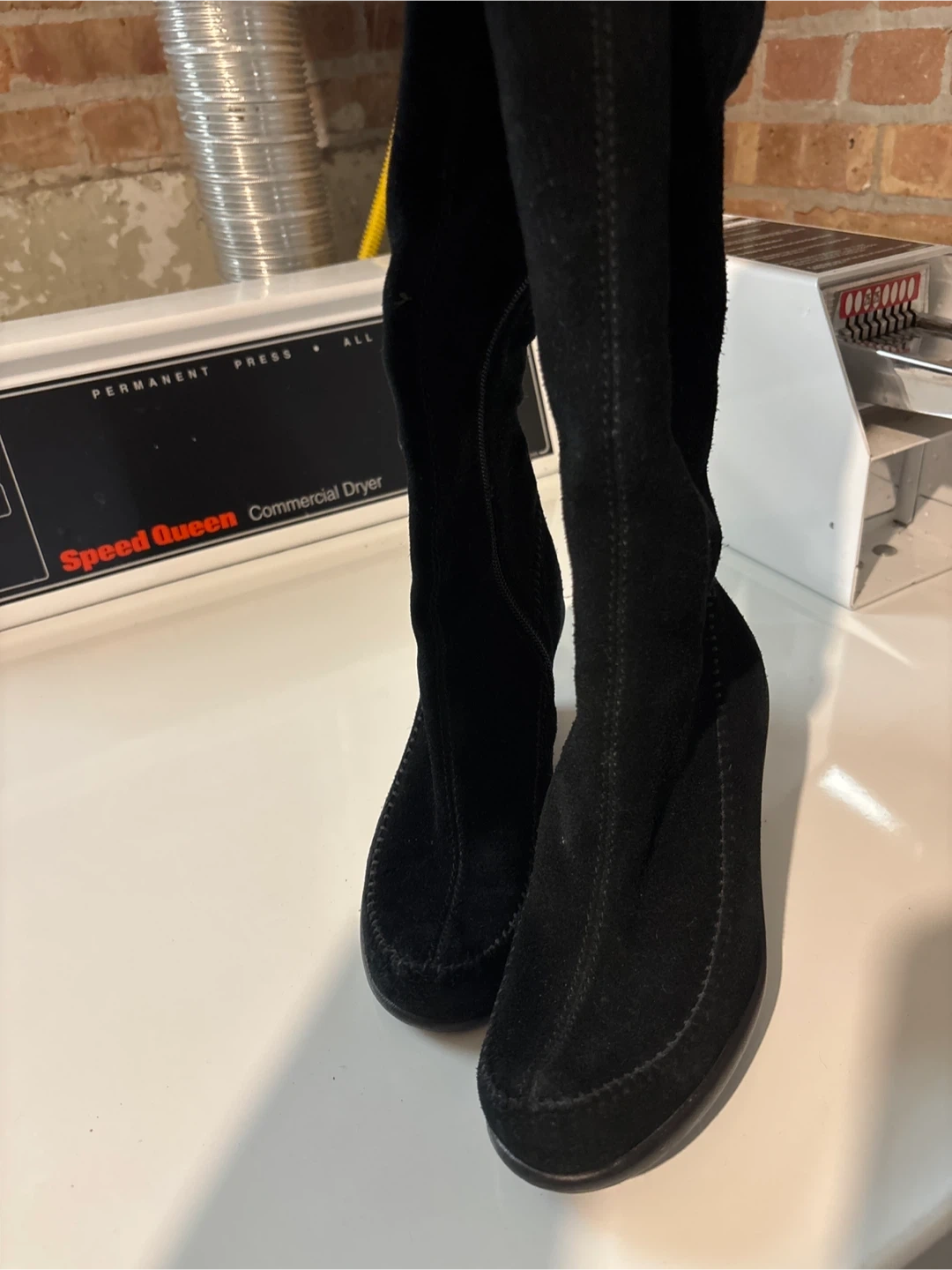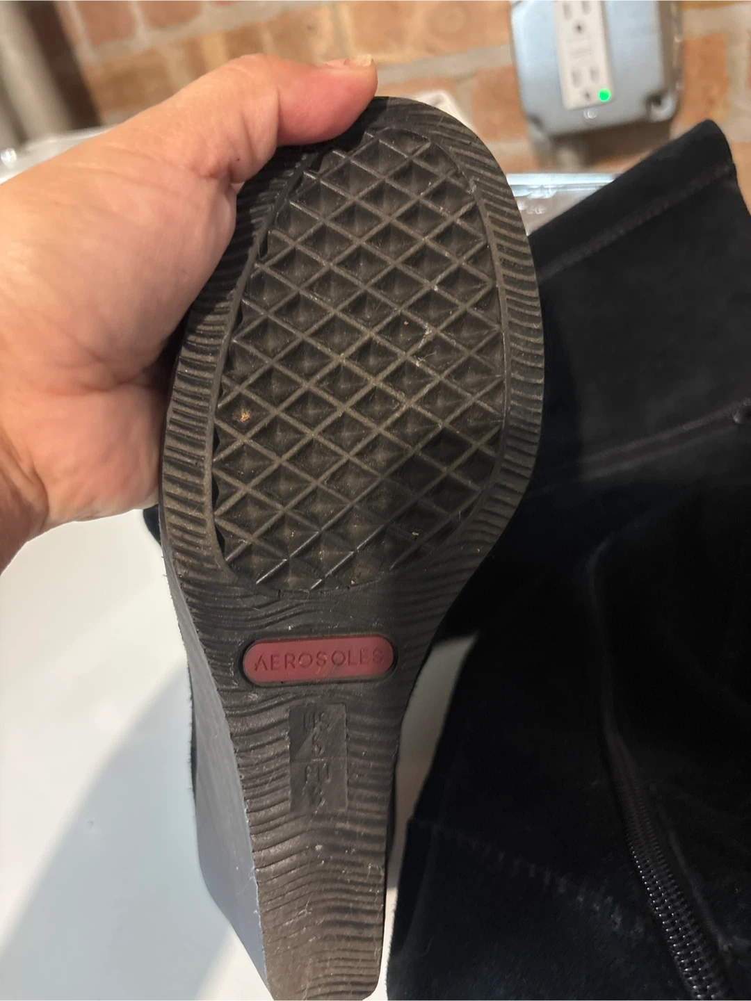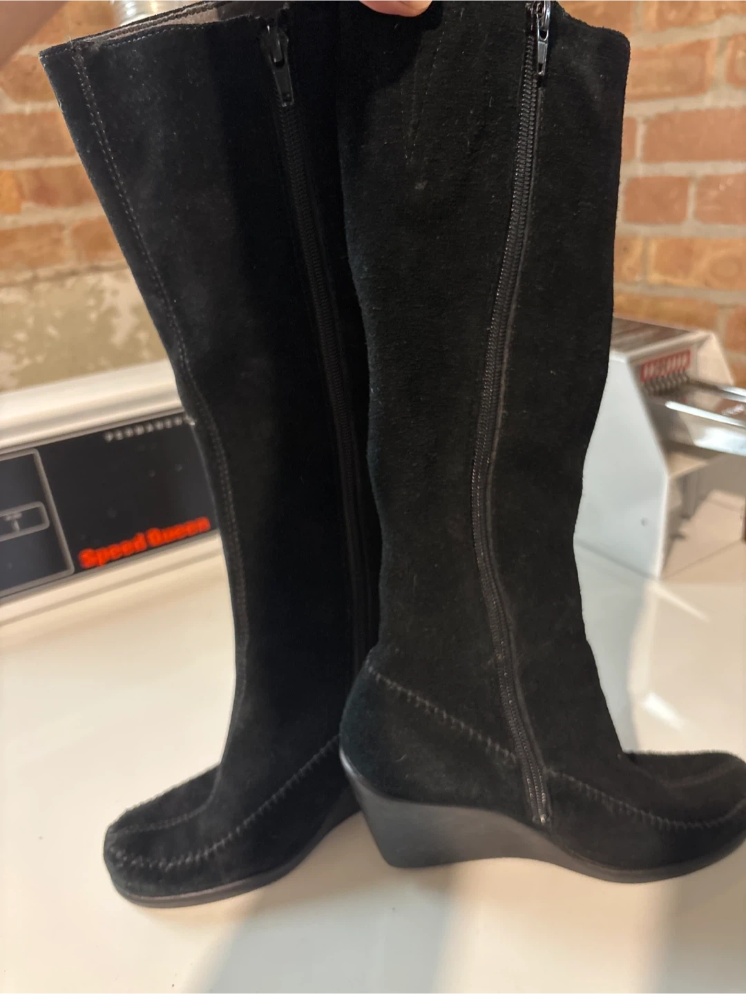 Selling a pair of Aerosoles knee-high boots in black suede! They are a size 5 and feature a comfortable wedge heel. These boots have a zipper for easy on and off. Swede feel