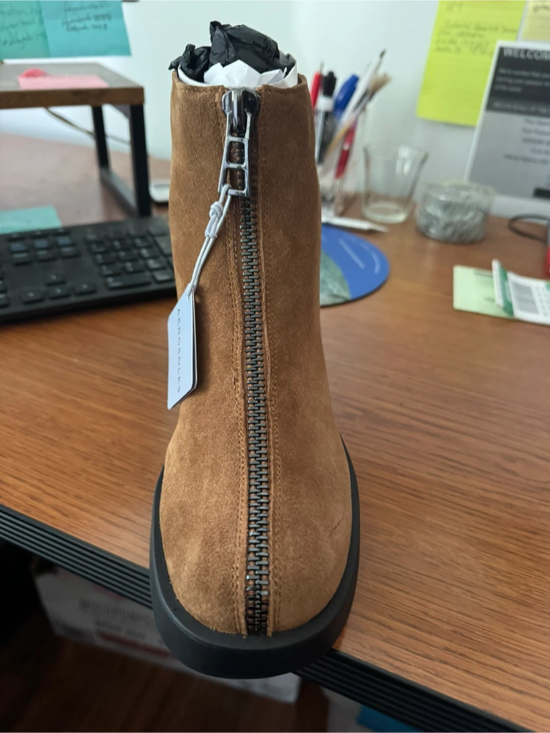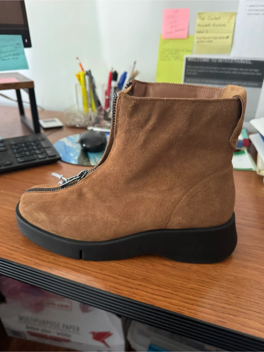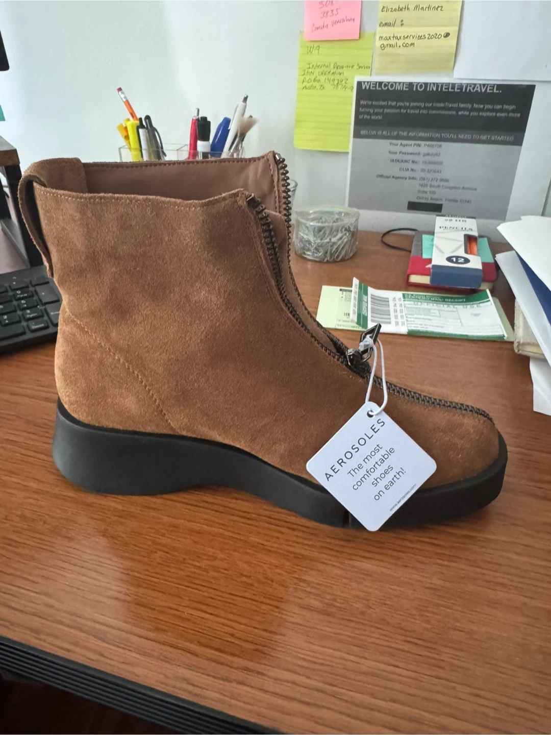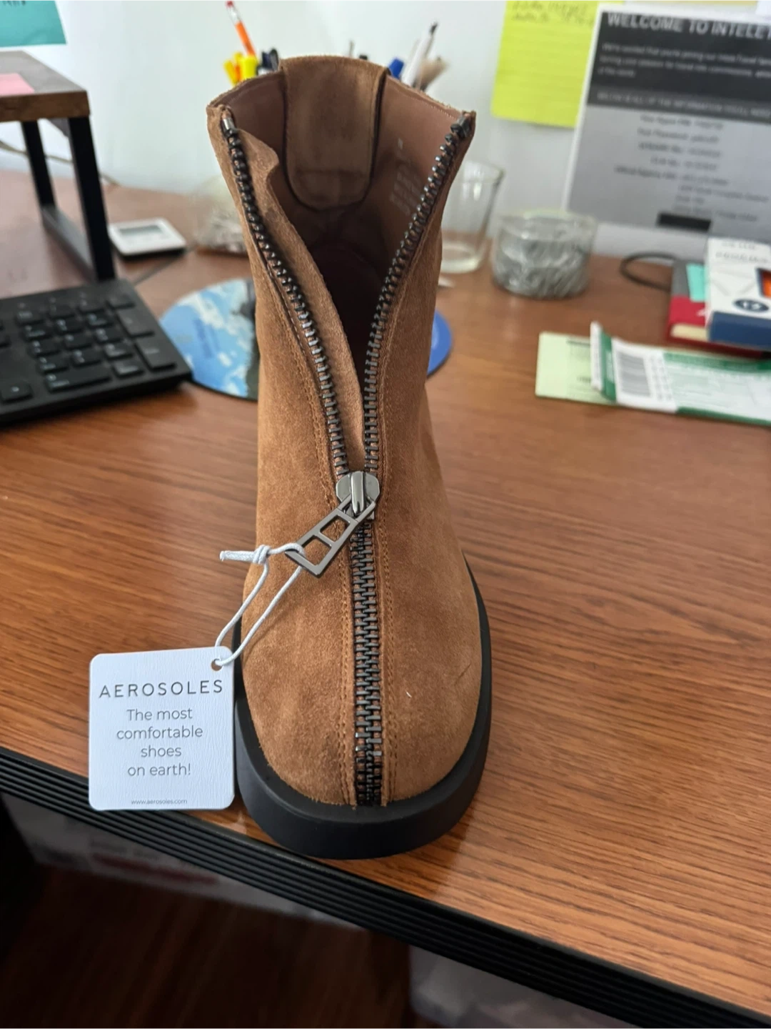10These Aerosoles booties are a stylish addition to any wardrobe! They are a beautiful brown suede with a unique zipper detail. The size is a women's US 8 Super comfortable and ready for a new home! Never worn!